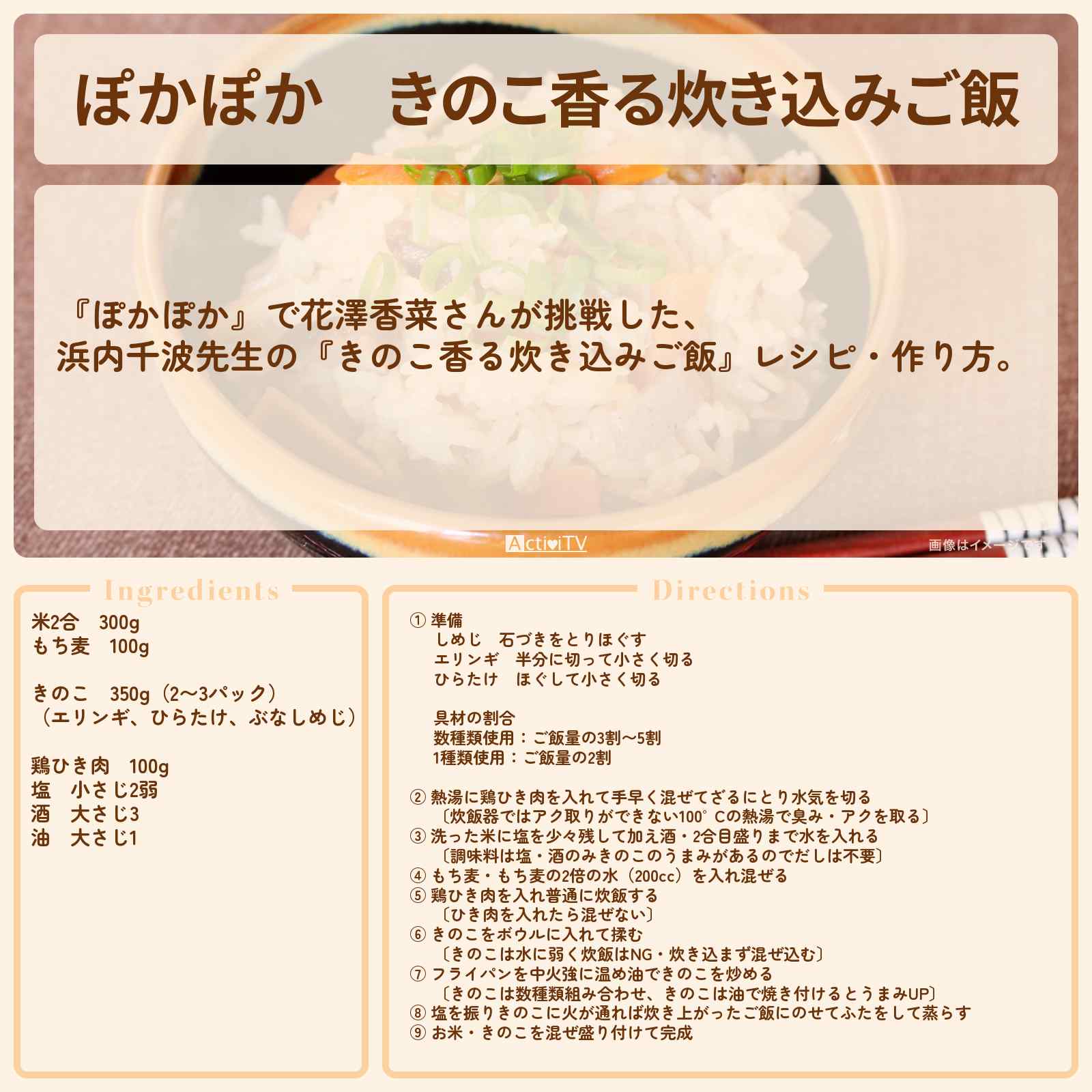 放送の【ぽかぽか】で花澤香菜さんが挑戦した、浜内千波先生の『きのこ香る炊き込みご飯』レシピ・作り方。