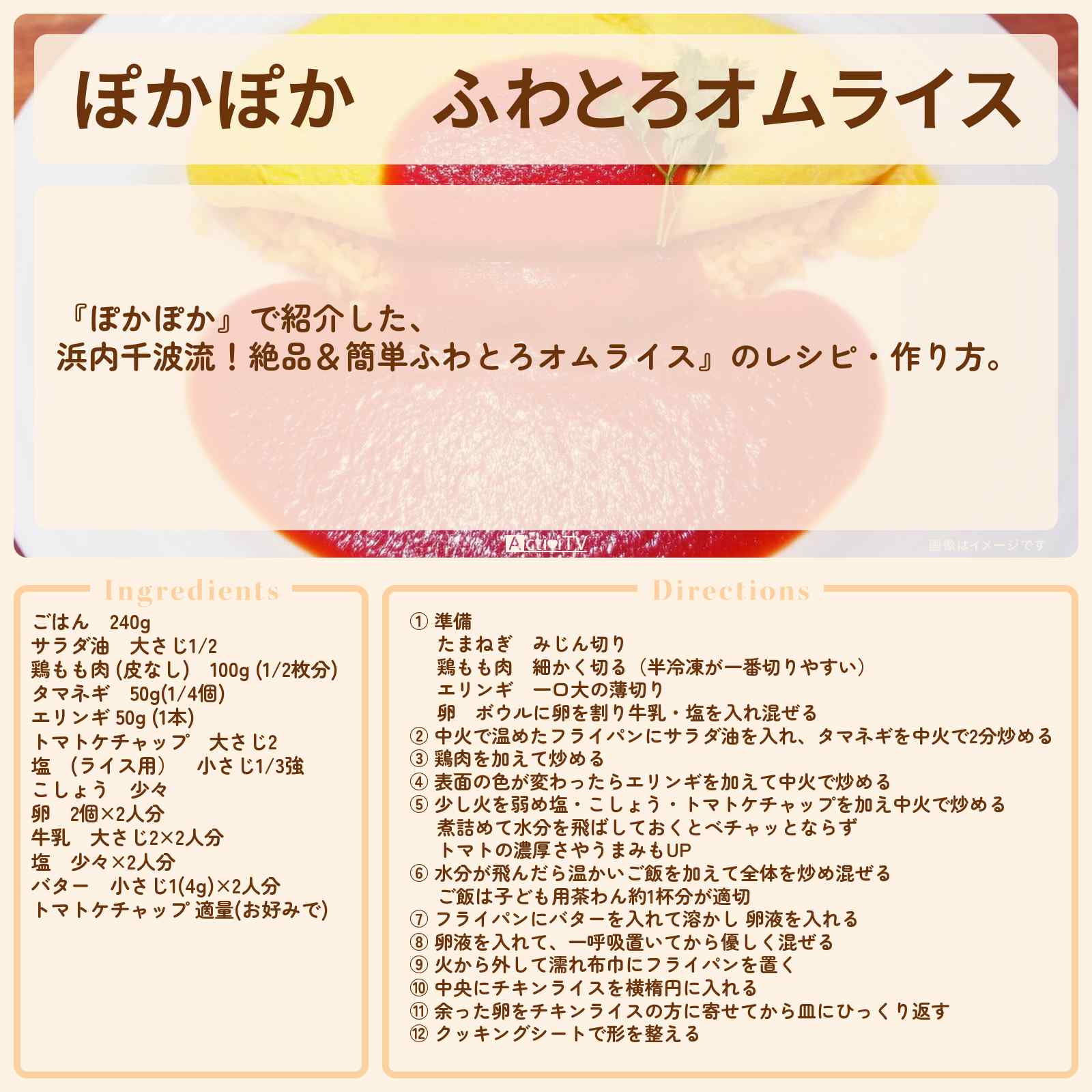 放送の【ぽかぽか】で紹介した、浜内千波流!絶品&簡単ふわとろオムライス』のレシピ・作り方。