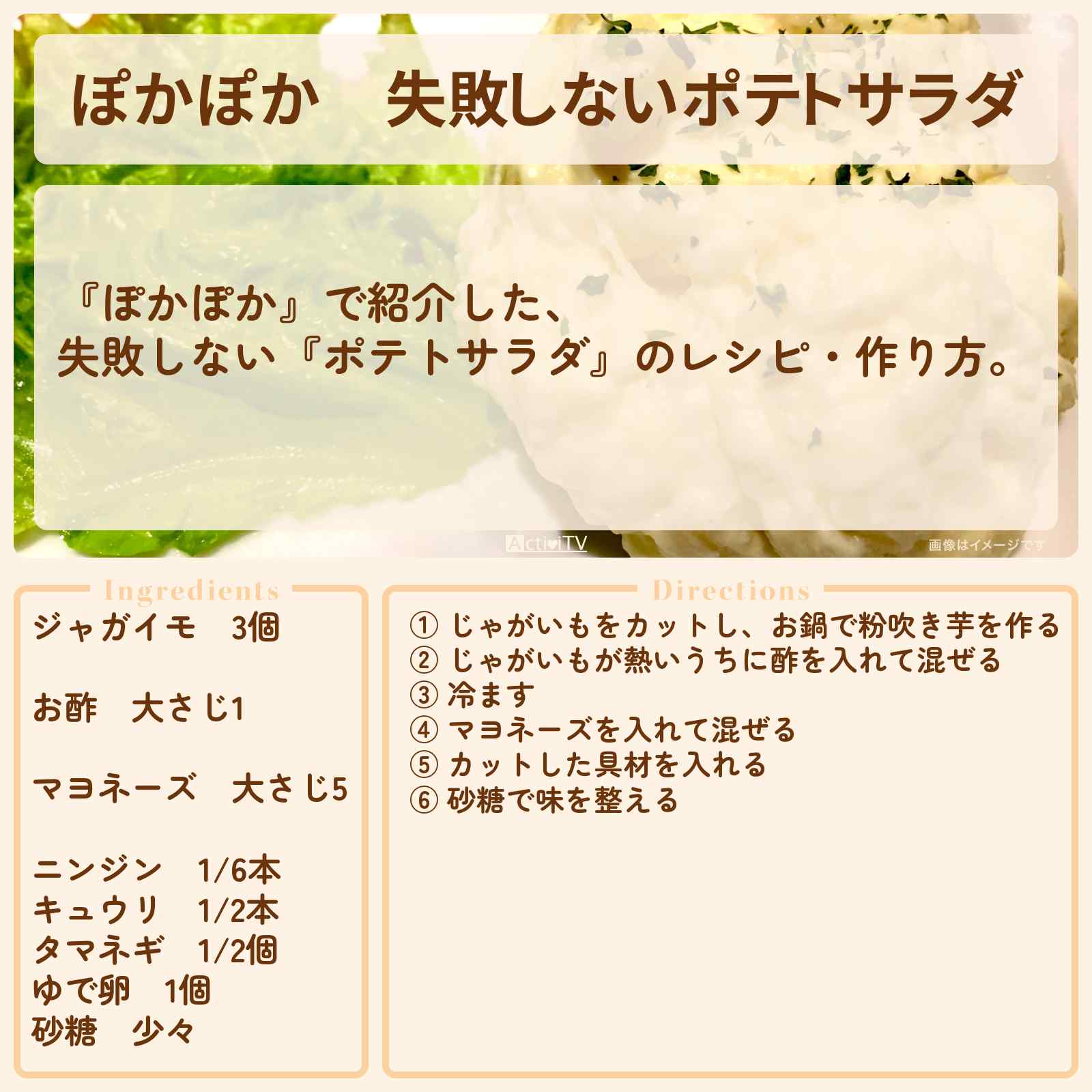 放送の【ぽかぽか】で紹介した、失敗しない『ポテトサラダ』のレシピ・作り方。