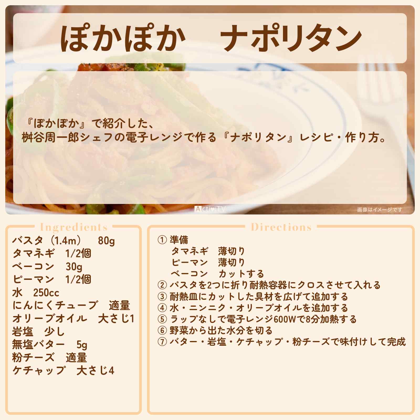 放送の【ぽかぽか】で紹介した、桝谷周一郎シェフの電子レンジで作る『ナポリタン』レシピ・作り方。