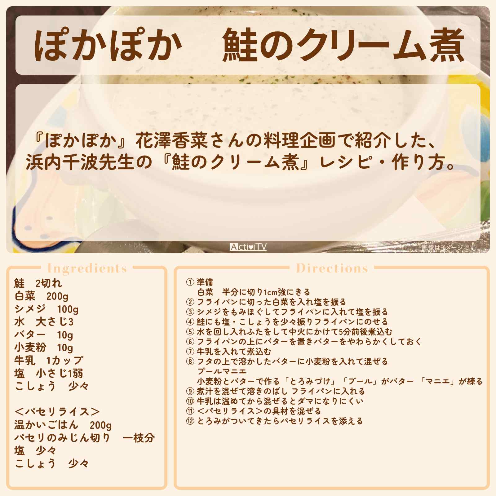 放送の【ぽかぽか】花澤香菜さんの料理企画で紹介した、浜内千波先生の『鮭のクリーム煮』レシピ・作り方。