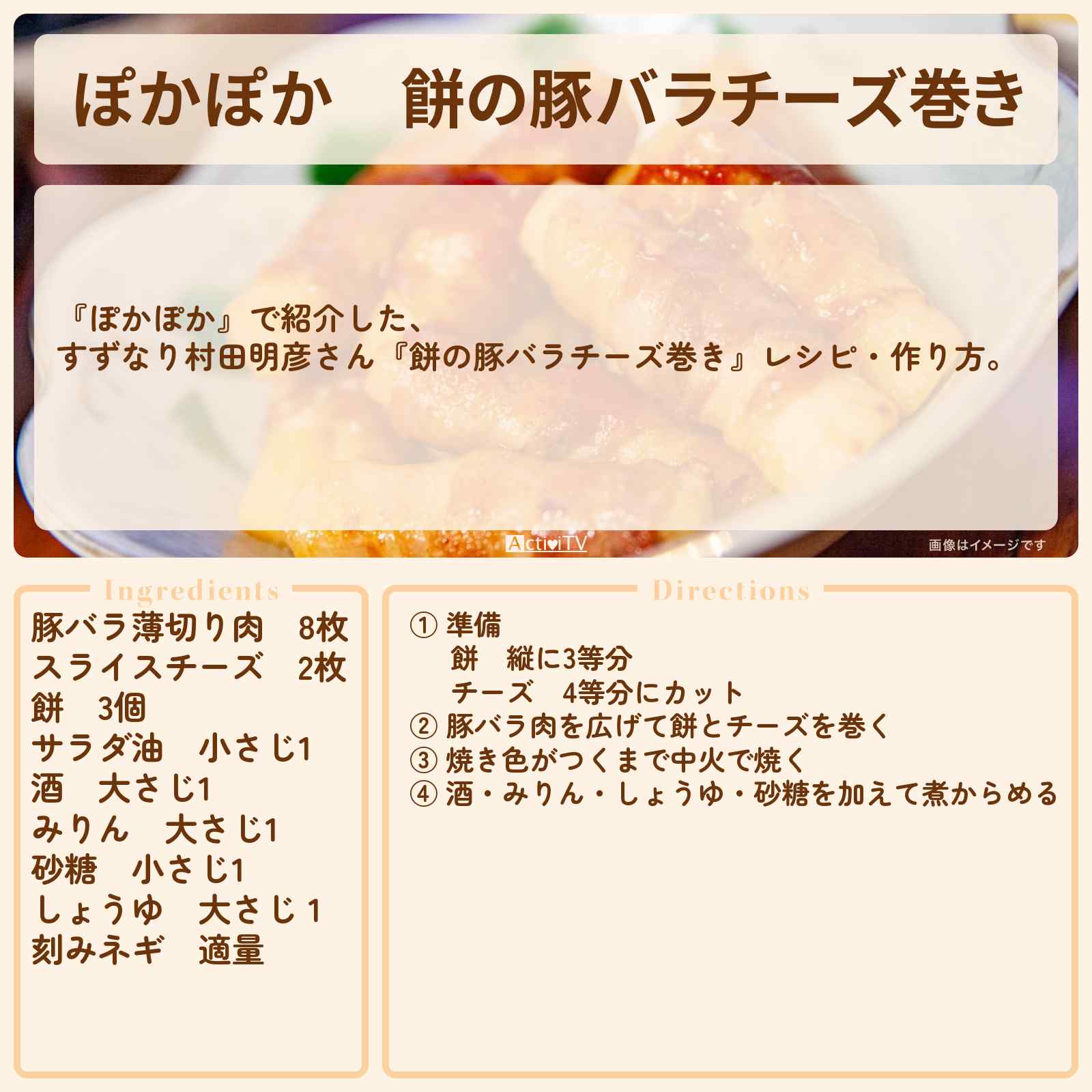 放送の【ぽかぽか】で紹介した、すずなり村田明彦さん『餅の豚バラチーズ巻き』レシピ・作り方。