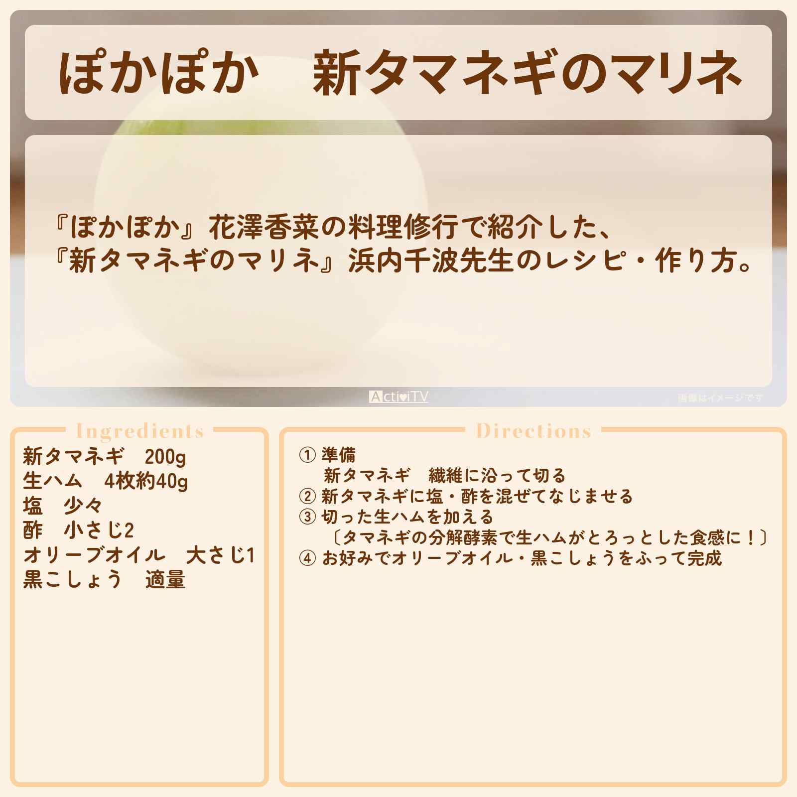 放送の【ぽかぽか】花澤香菜の料理修行で紹介した、『新タマネギのマリネ』浜内千波先生のレシピ・作り方。
