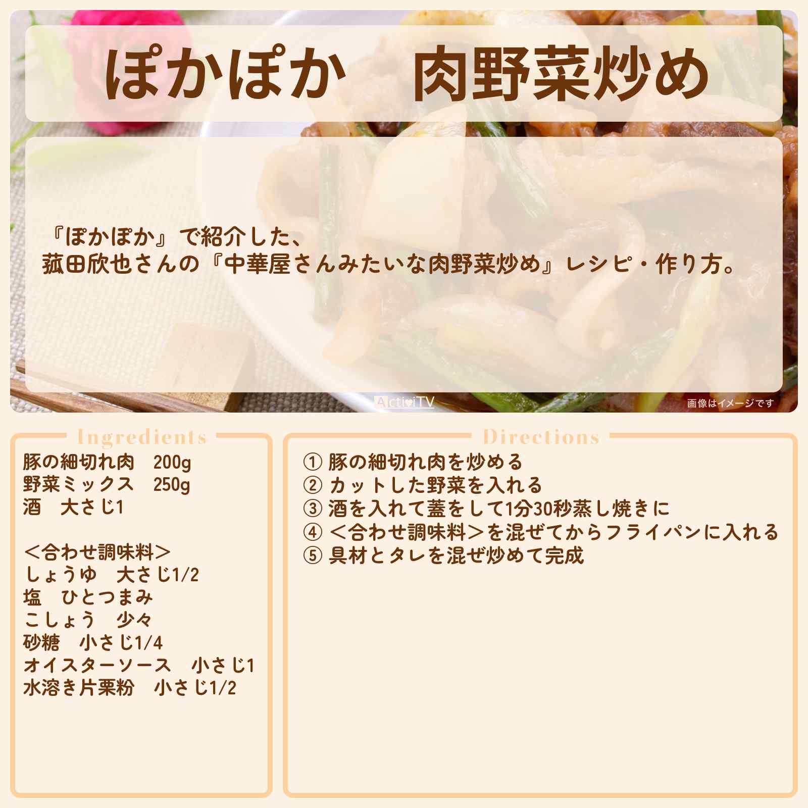 放送の【ぽかぽか】で紹介した、菰田欣也さんの『中華屋さんみたいな肉野菜炒め』レシピ・作り方。
