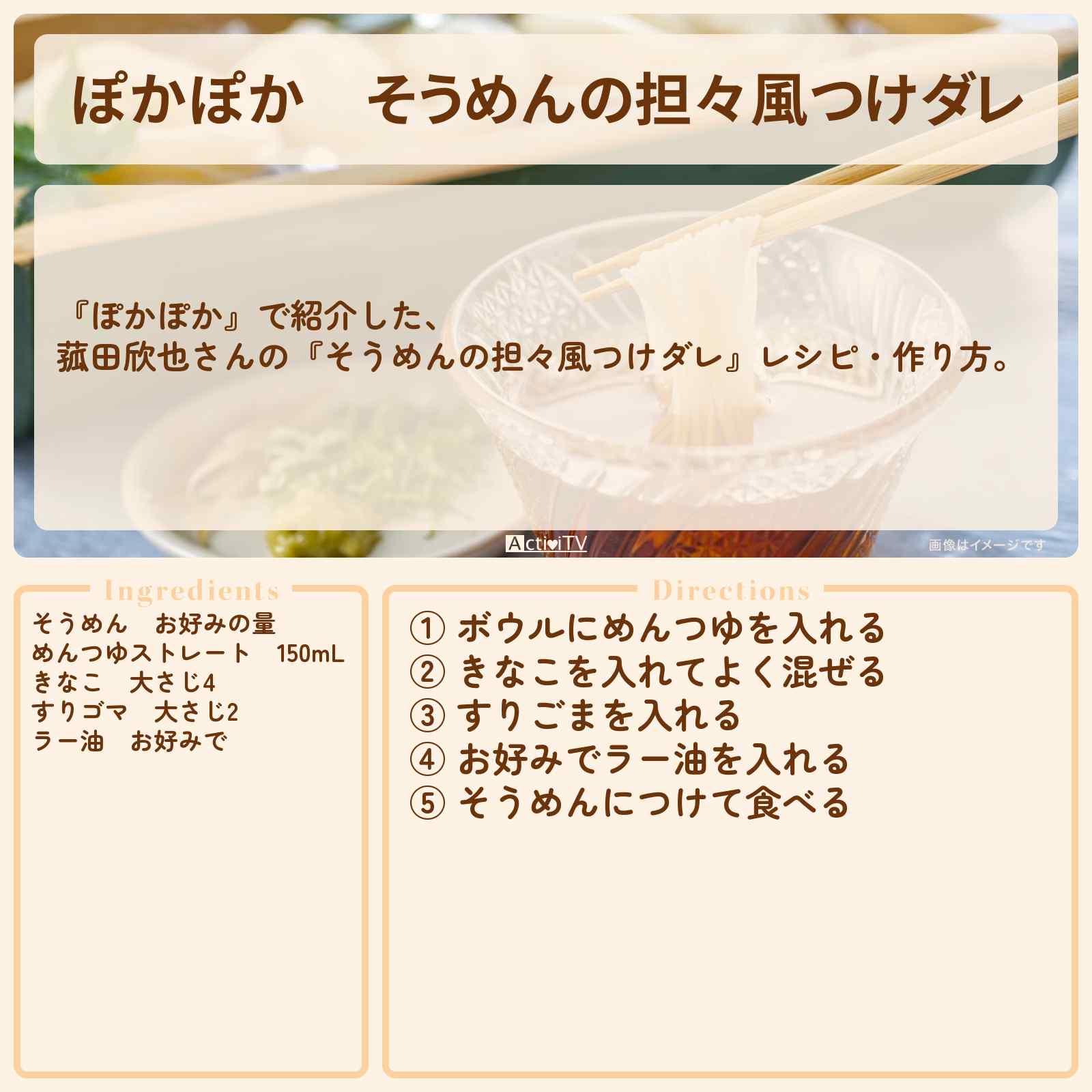 放送の【ぽかぽか】で紹介した、菰田欣也さんの『そうめんの担々風つけダレ』レシピ・作り方。