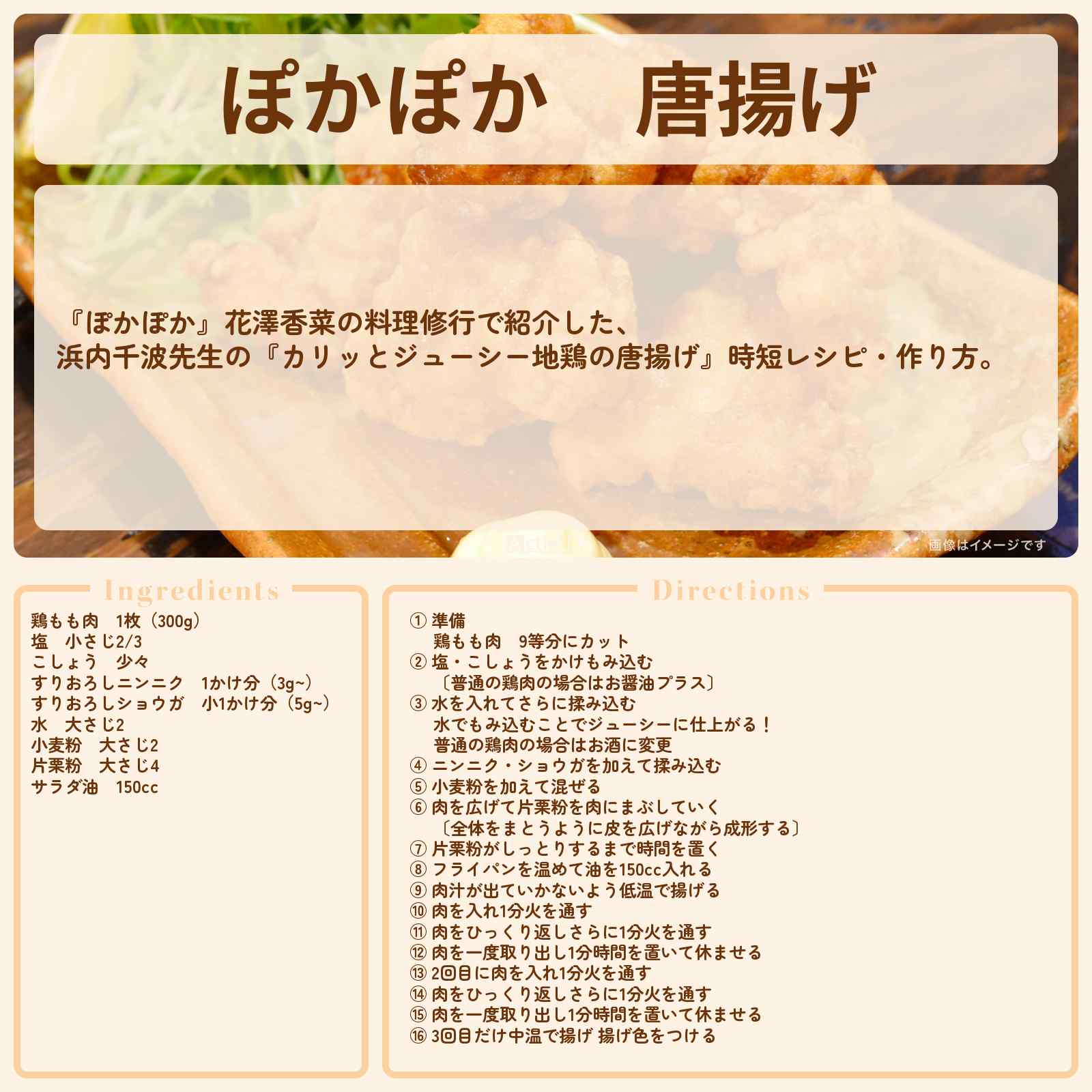 放送の【ぽかぽか】花澤香菜の料理修行で紹介した、浜内千波先生の『カリッとジューシー地鶏の唐揚げ』時短レシピ・作り方。