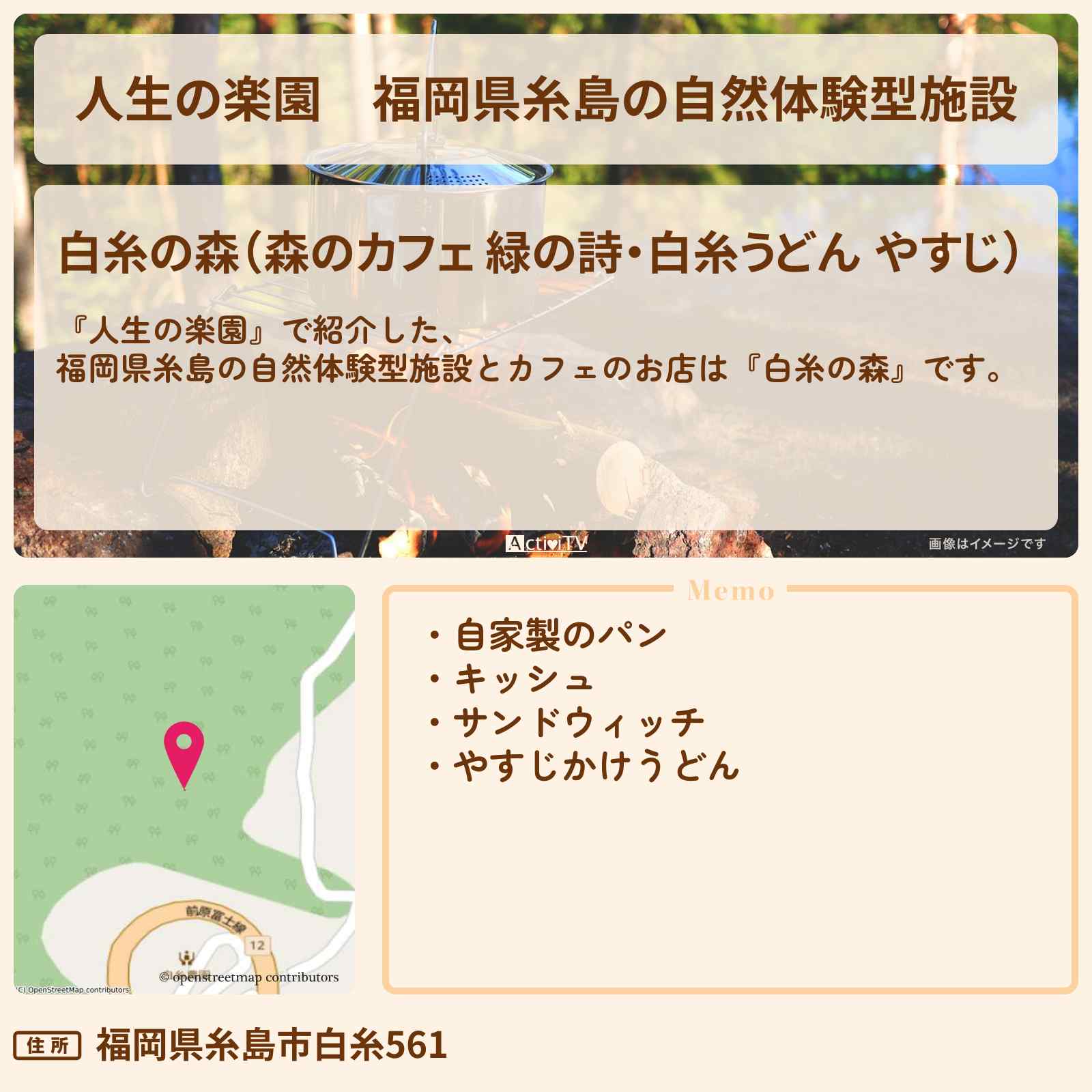 白糸の森(有限会社プランニングマエダ)は、福岡県糸島市白糸で体験型観光農園施設を運営しております。自然農法にて育てられた美味しい野菜や、こだわり素材を使ったうどん屋(白糸うどん やすじ)、森のお菓子屋(緑の詩〜おと〜)を展開。白糸の自然の恵みを提供しています。…