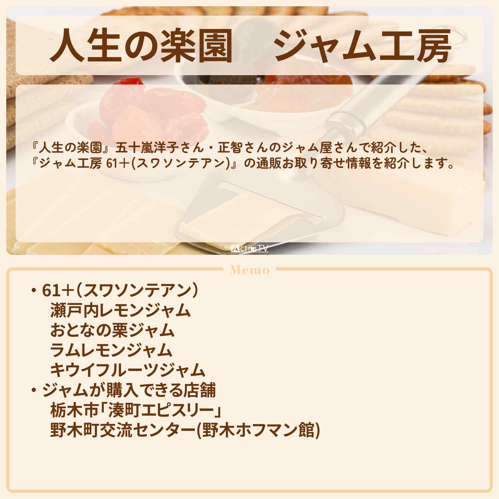 放送の【人生の楽園】五十嵐洋子さん・正智さんのジャム屋さんで紹介した、『ジャム工房 61+(スワソンテアン)』の通販お取り寄せ情報を紹介します。