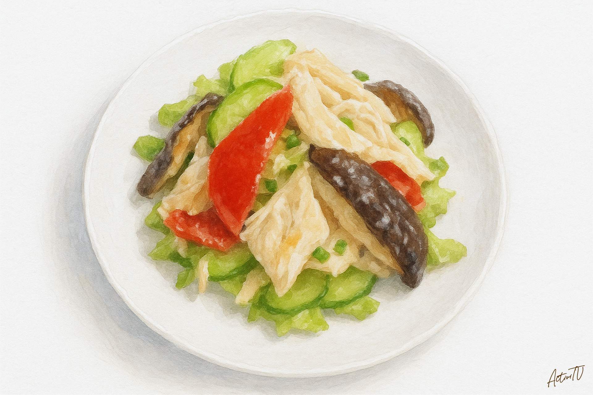 しょうがをたっぷり使った香り高いジンジャーソースで、しっとり焼いたささみとコリコリ食感のきくらげを和える一皿。セロリの爽やかさと赤ピーマンの甘みが加わり、後味は軽やかなのに満足感はしっかり。ソースはすりおろし汁と繊維を合わせることで、辛味と香りが立ちつつ角のない風味にまとまるのが魅力。