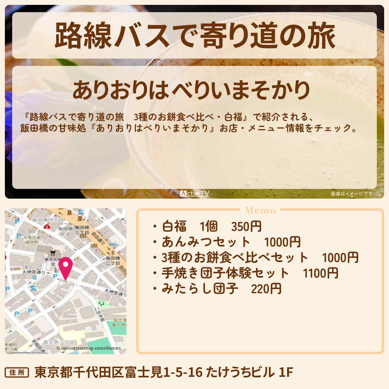 2023年7月30日放送の【路線バスで寄り道の旅 3種のお餅食べ比べ・白福】で紹介される、飯田橋の甘味処『ありおりはべりいまそかり』お店・メニュー情報をチェック。