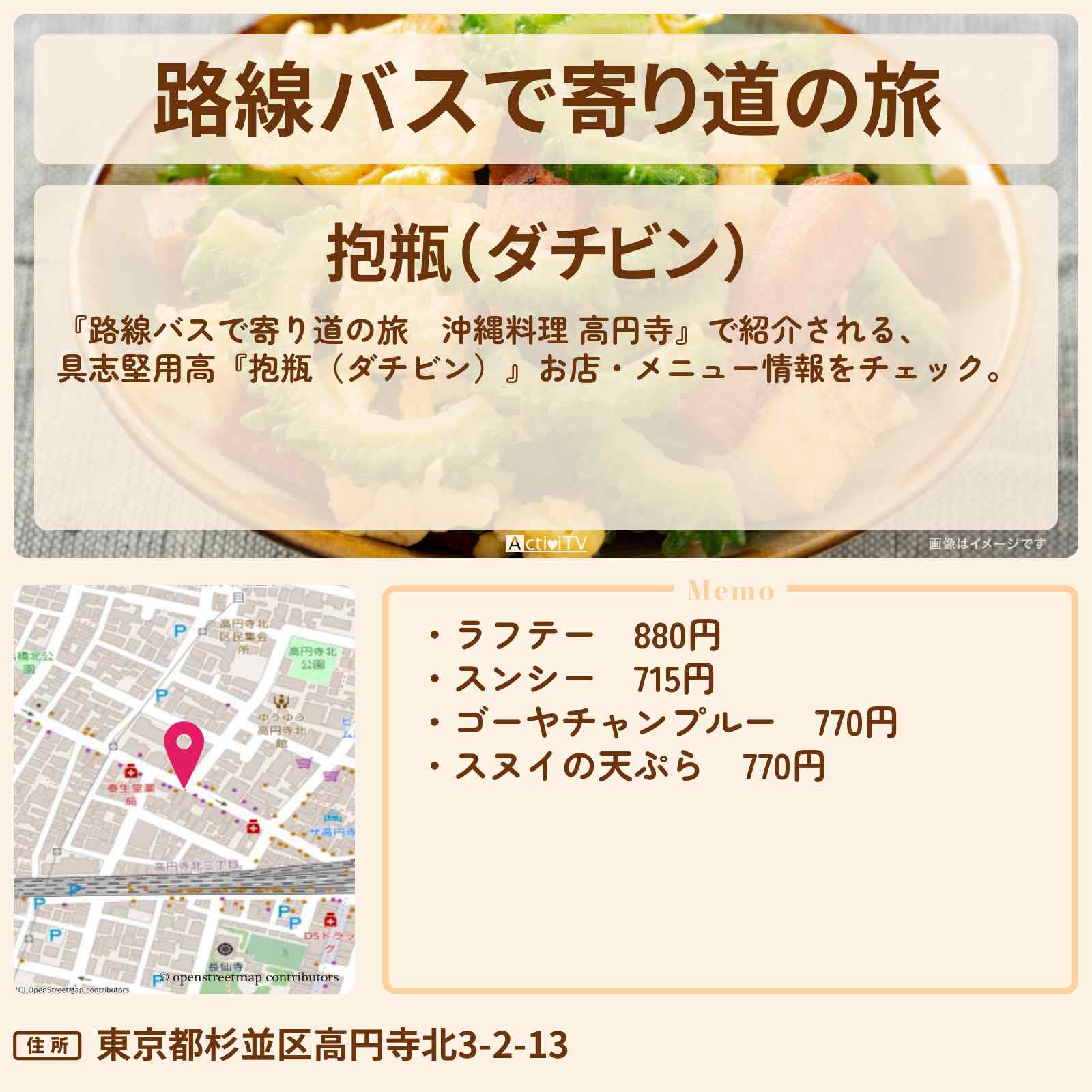 2023年7月30日放送の【路線バスで寄り道の旅 沖縄料理 高円寺】で紹介される、具志堅用高『抱瓶(ダチビン)』お店・メニュー情報をチェック。