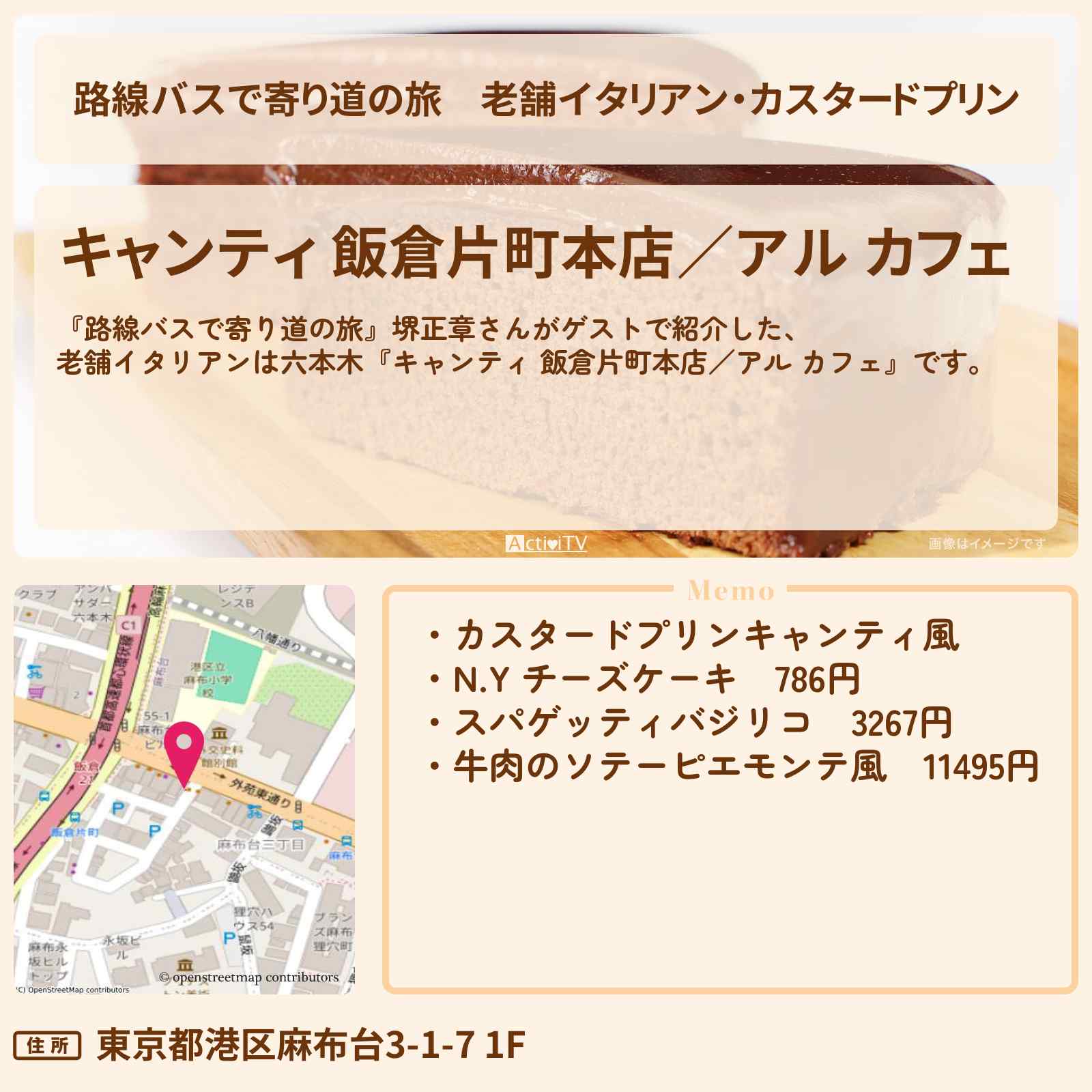 2023年9月10日放送の【路線バスで寄り道の旅】堺正章さんがゲストで紹介した、老舗イタリアンは六本木『キャンティ 飯倉片町本店/アル カフェ』です。