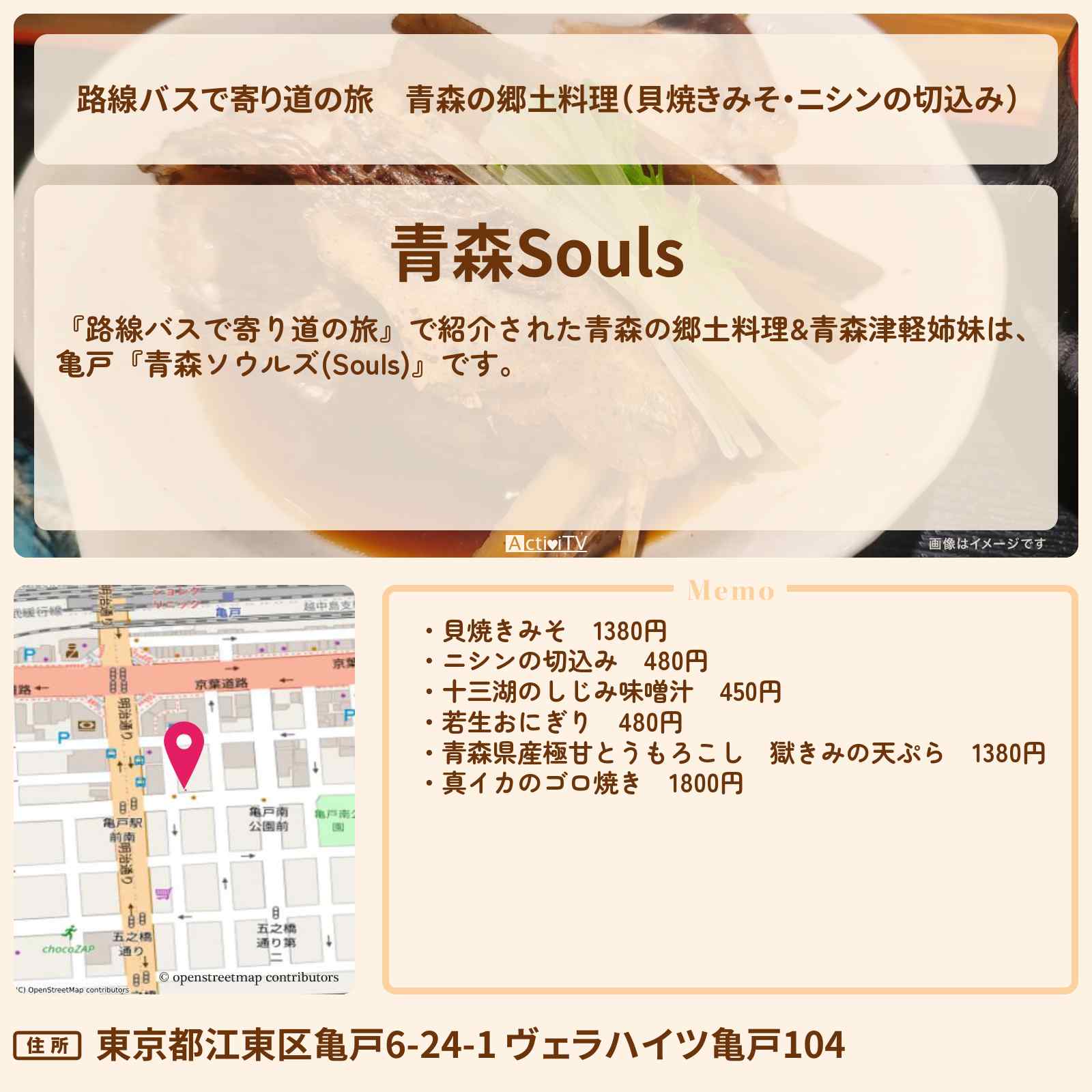 放送の【路線バスで寄り道の旅】で紹介された青森の郷土料理&青森津軽姉妹は、亀戸『青森ソウルズ(Souls)』です。