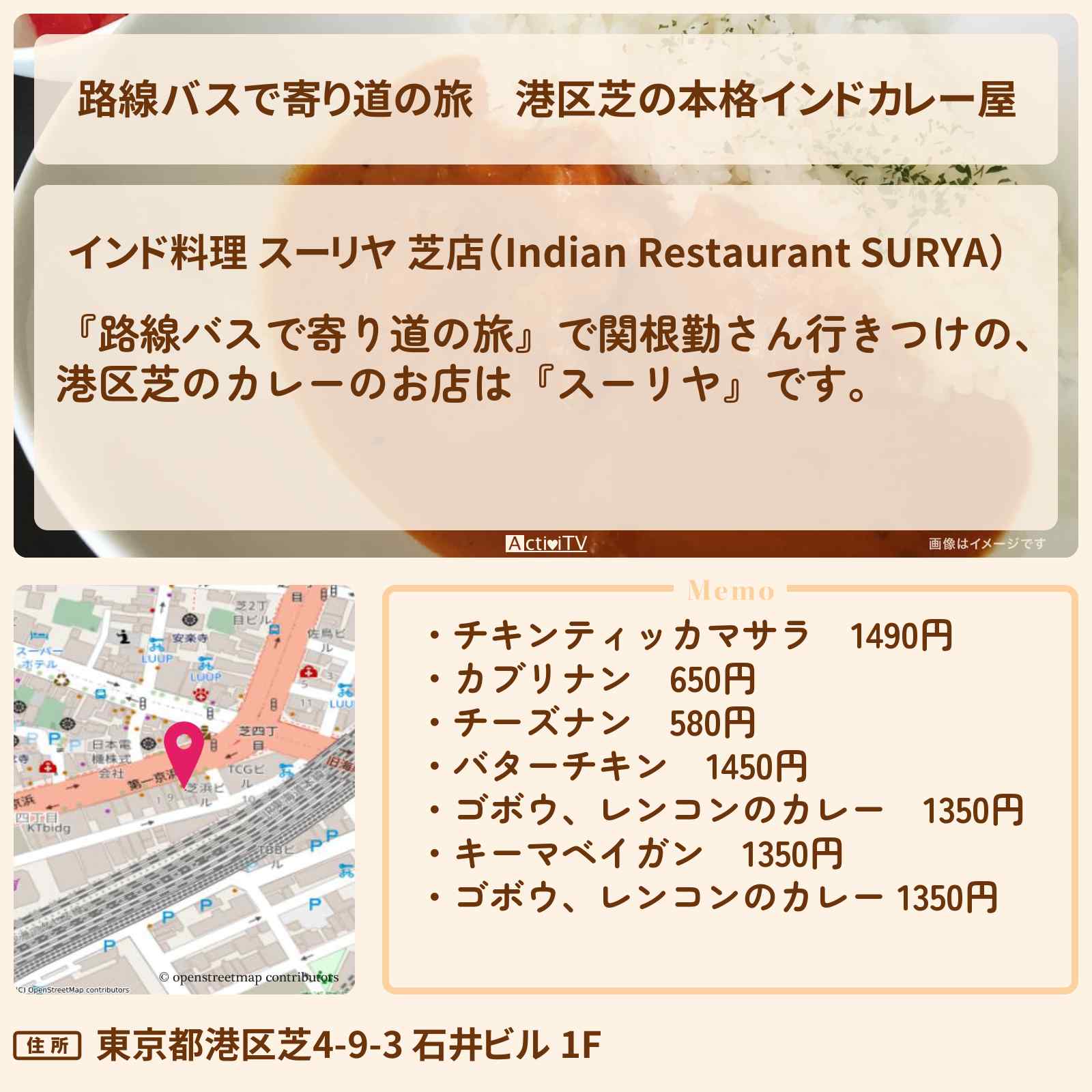 放送の【路線バスで寄り道の旅】で関根勤さん行きつけの、港区芝のカレーのお店は『スーリヤ』です。
