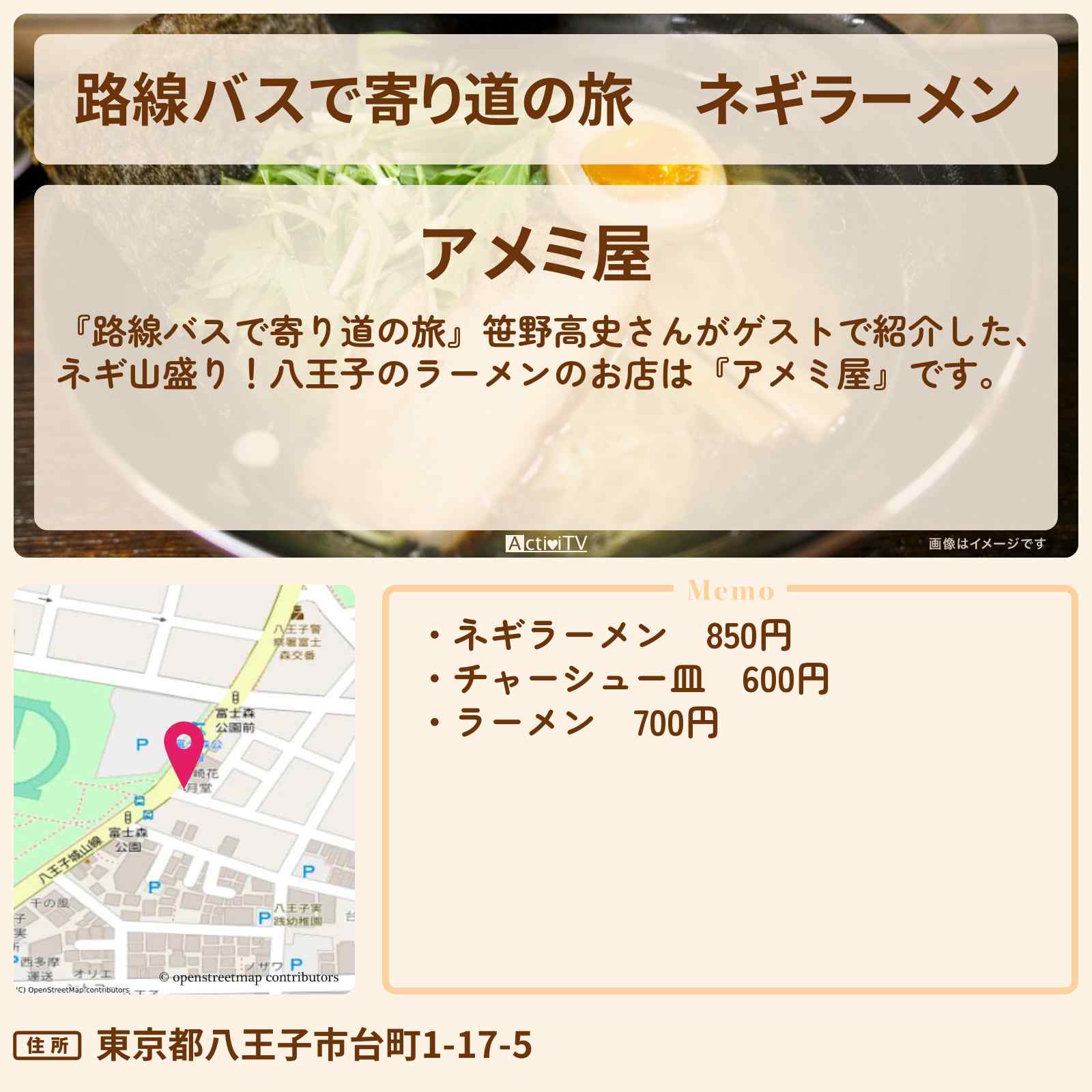 放送の【路線バスで寄り道の旅】笹野高史さんがゲストで紹介した、ネギ山盛り!八王子のラーメンのお店は『アメミ屋』です。