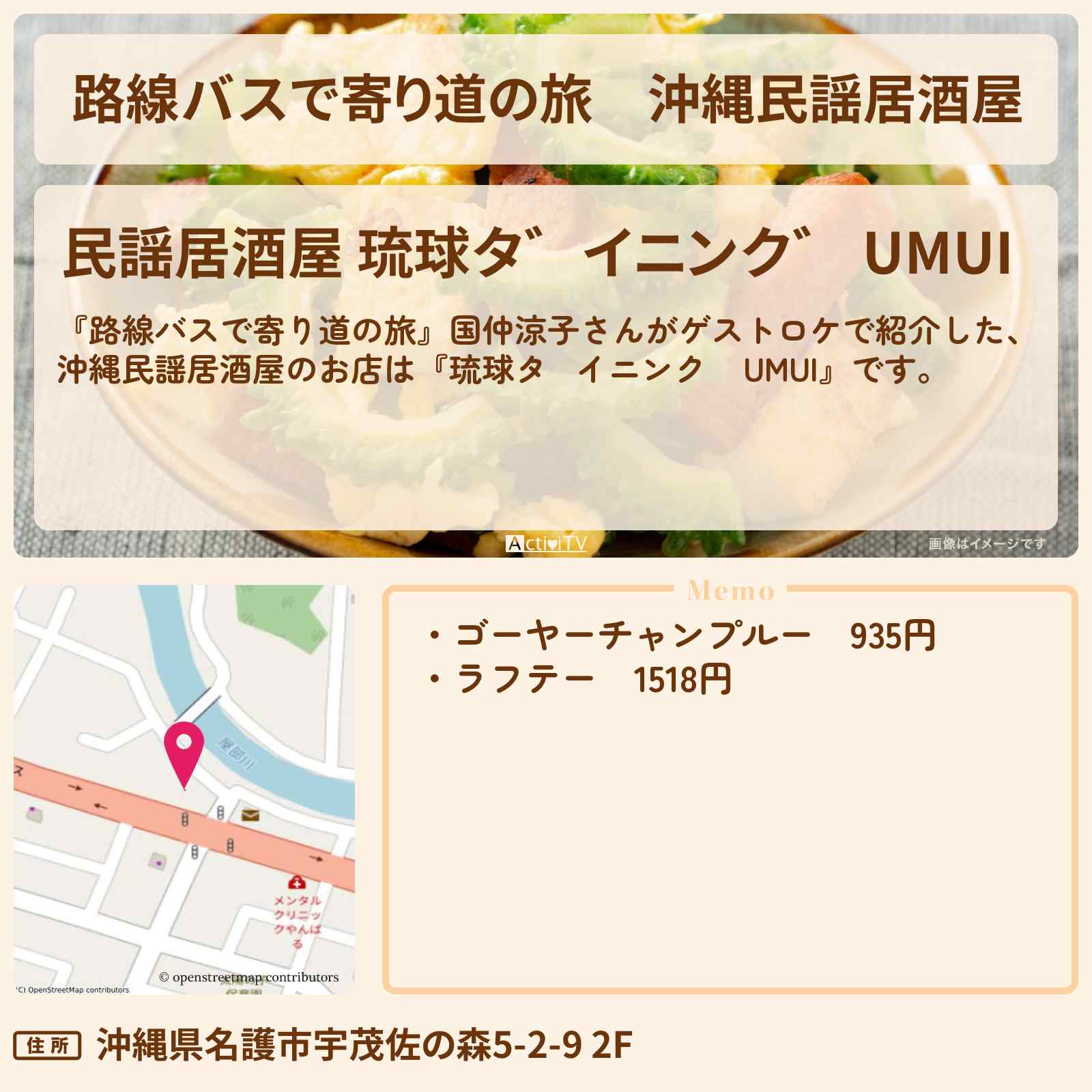 放送の【路線バスで寄り道の旅】国仲涼子さんがゲストロケで紹介した、沖縄民謡居酒屋のお店は『琉球ダイニング UMUI』です。