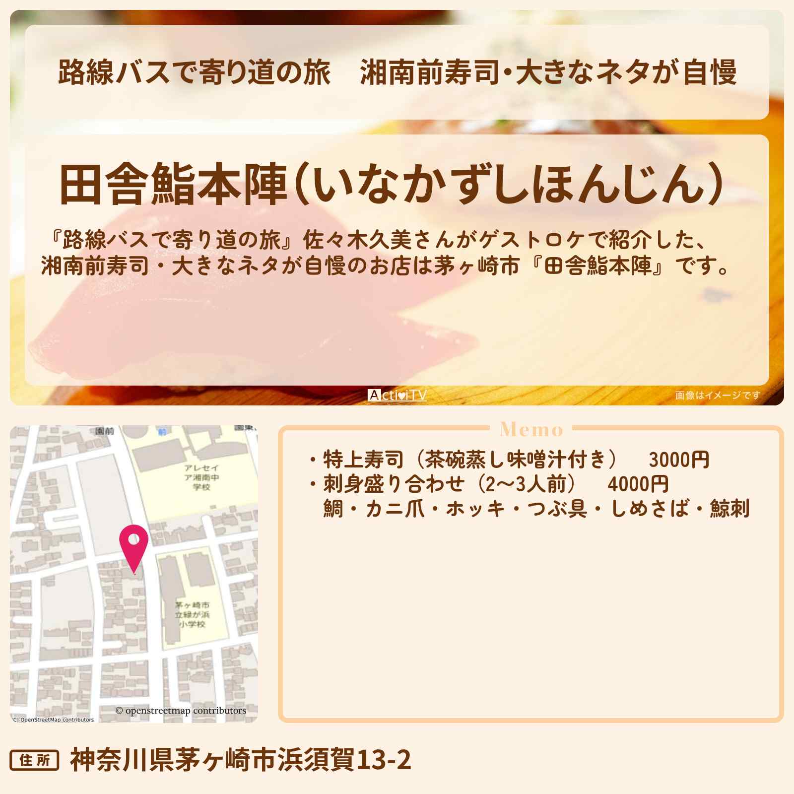 田舎鮨本陣(茅ヶ崎/和食/寿司)の店舗情報・予約なら、お得なクーポン満載【ホットペッパーグルメ】!田舎鮨本陣のおすすめポイントは、大勢でもOKのファミリー用と少人数用のテーブルがある。子ども用メニュー……