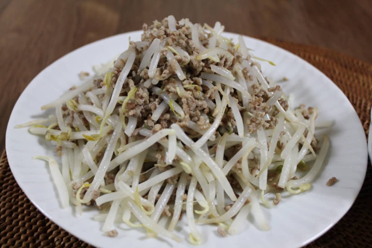 - 肉の色が完全に変わったら<A用調味料>を加えて炒め、全体がなじんだらもやしを加えて炒め合わせる