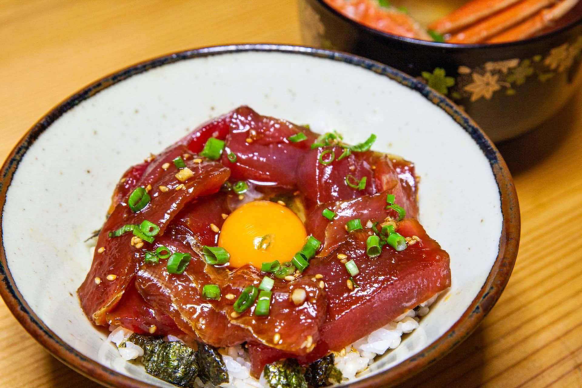 マグロ盛り付けを中央を少しくぼませ、卵黄をのせる