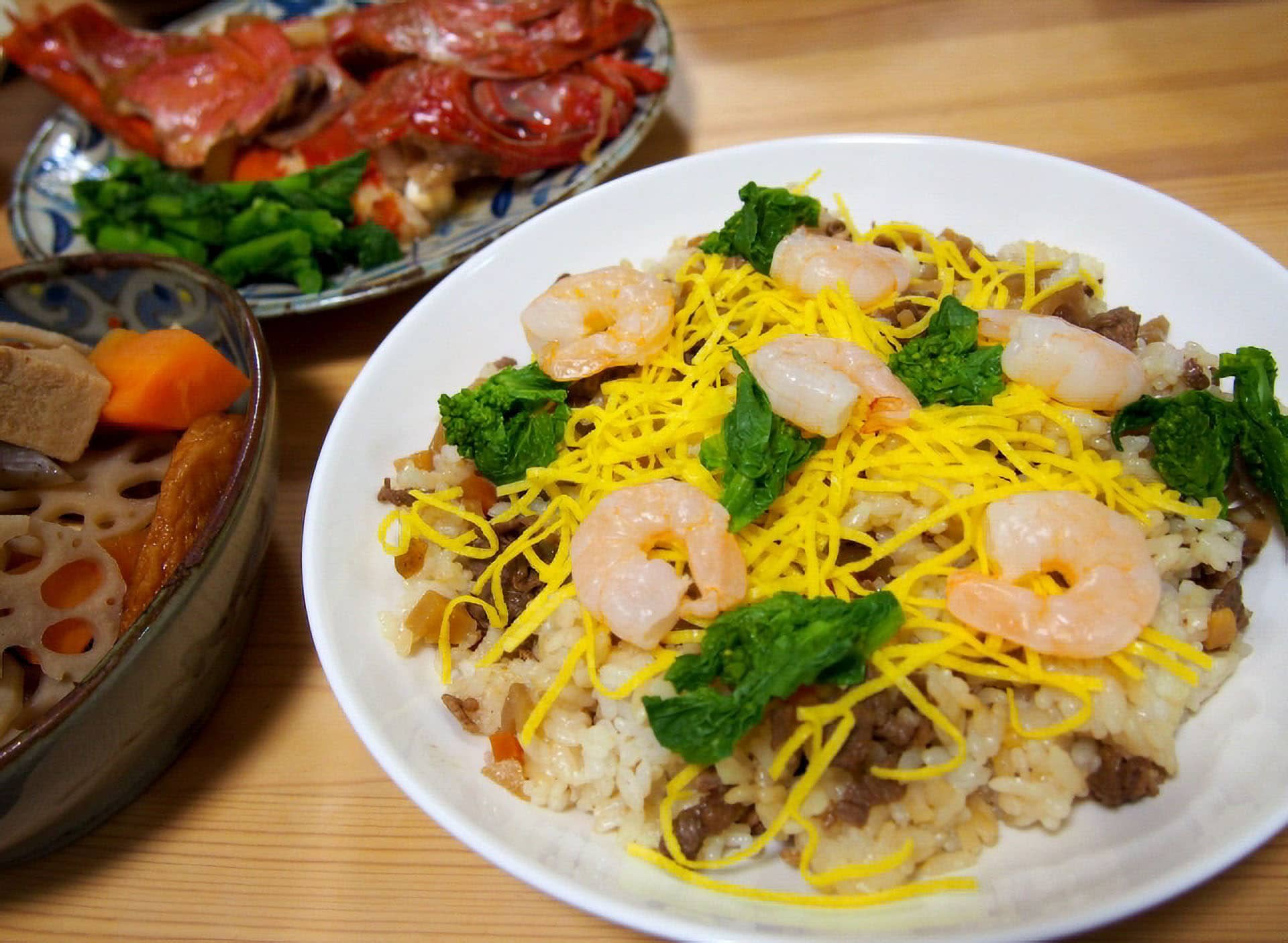 - 熱が取れたら器に盛り、いり卵・絹さや・えびをのせる