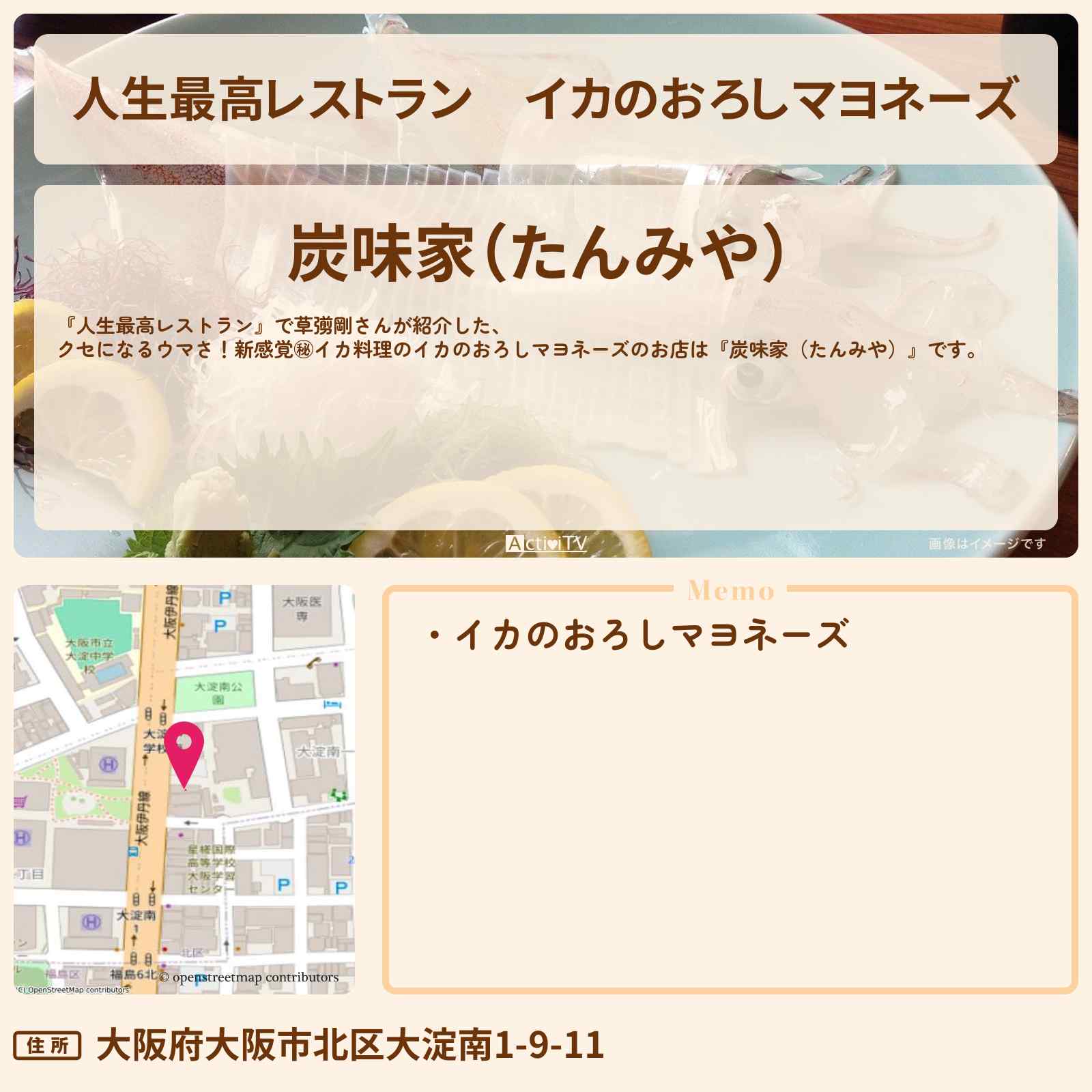 放送の【人生最高レストラン】で草彅剛さんが紹介した、クセになるウマさ!新感覚㊙イカ料理のイカのおろしマヨネーズのお店は『炭味家(たんみや)』です。