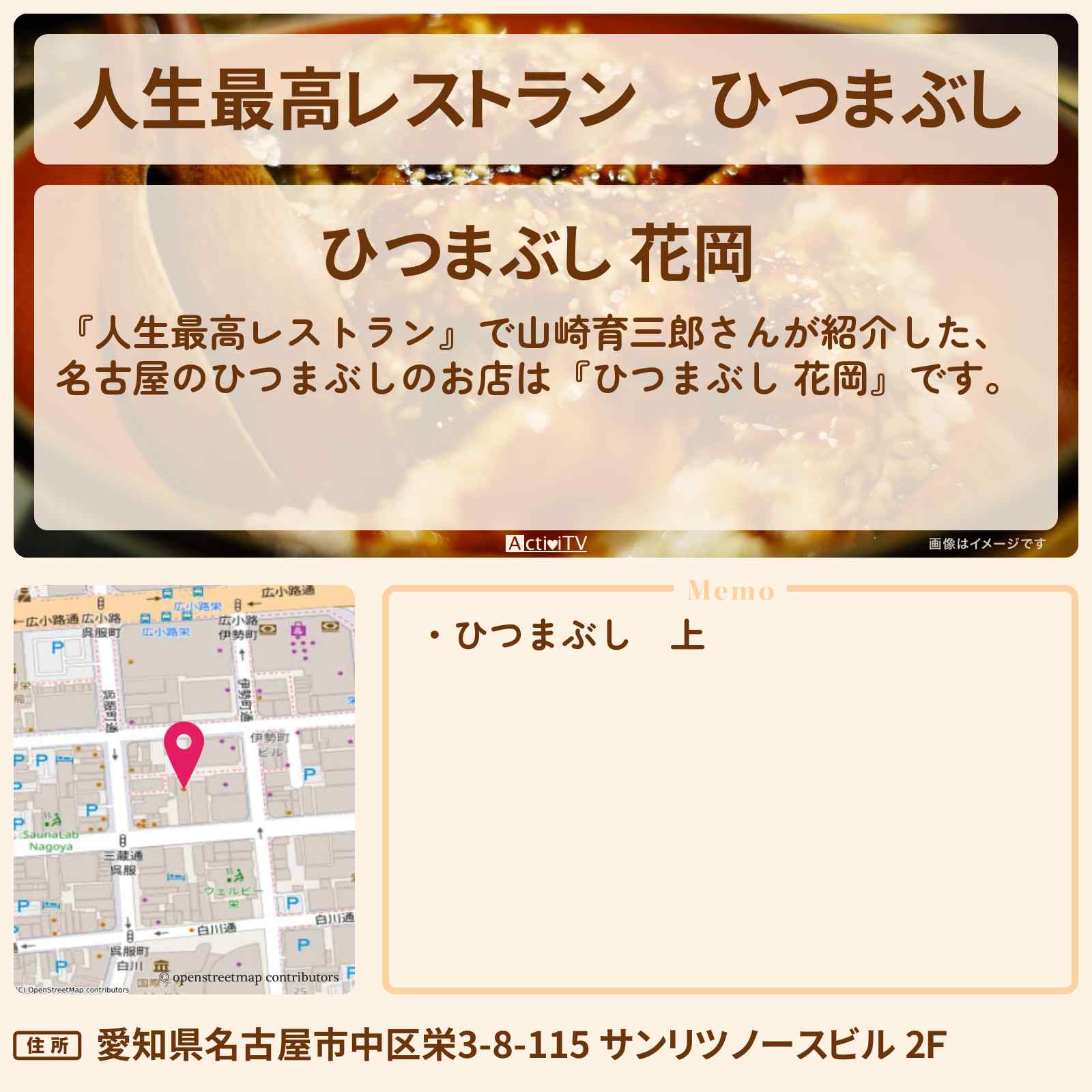 放送の【人生最高レストラン】で山崎育三郎さんが紹介した、名古屋のひつまぶしのお店は『ひつまぶし 花岡』です。