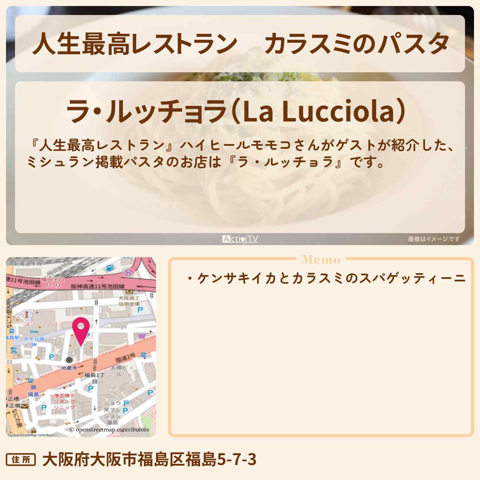 放送の【人生最高レストラン】ハイヒールモモコさんがゲストが紹介した、ミシュラン掲載パスタのお店は『ラ・ルッチョラ』です。