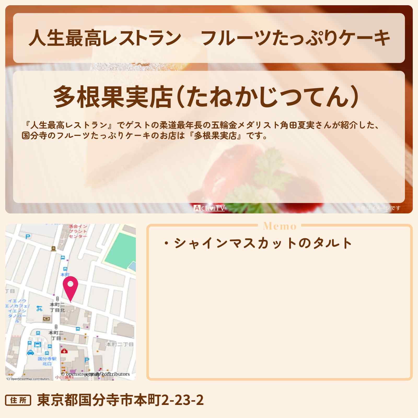 放送の【人生最高レストラン】でゲストの柔道最年長の五輪金メダリスト角田夏実さんが紹介した、国分寺のフルーツたっぷりケーキのお店は『多根果実店』です。