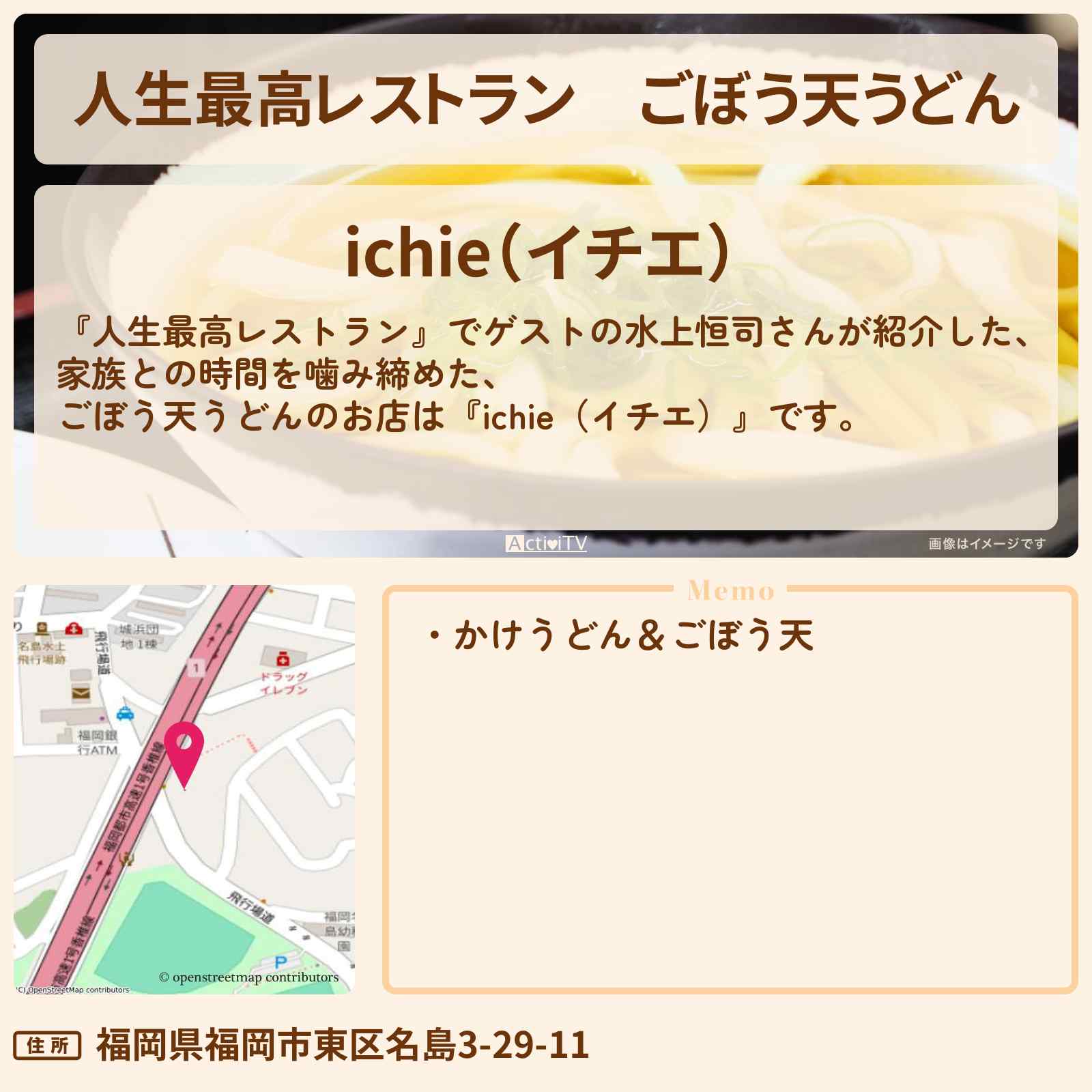 放送の【人生最高レストラン】でゲストの水上恒司さんが紹介した、家族との時間を噛み締めた、ごぼう天うどんのお店は『ichie(イチエ)』です。