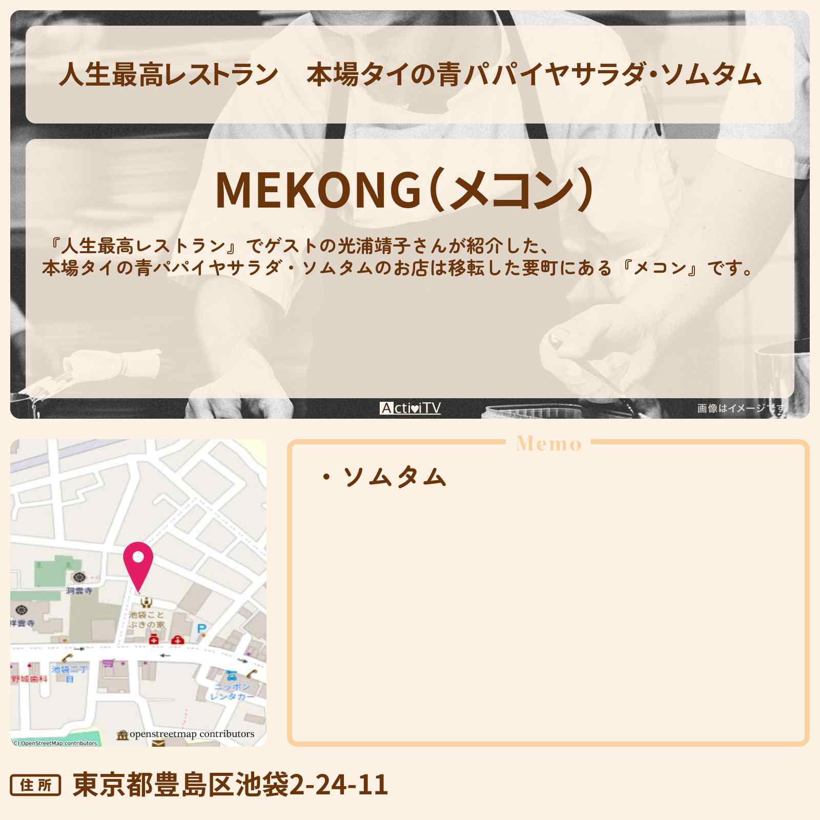 【人生最高レストラン】本場タイの青パパイヤサラダ・ソムタム 光浦靖子『メコン』のお店の場所