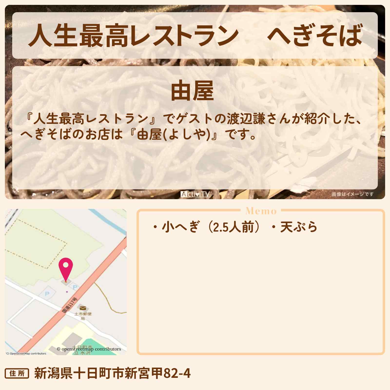 放送の【人生最高レストラン】でゲストの渡辺謙さんが紹介した、へぎそばのお店は『由屋(よしや)』です。