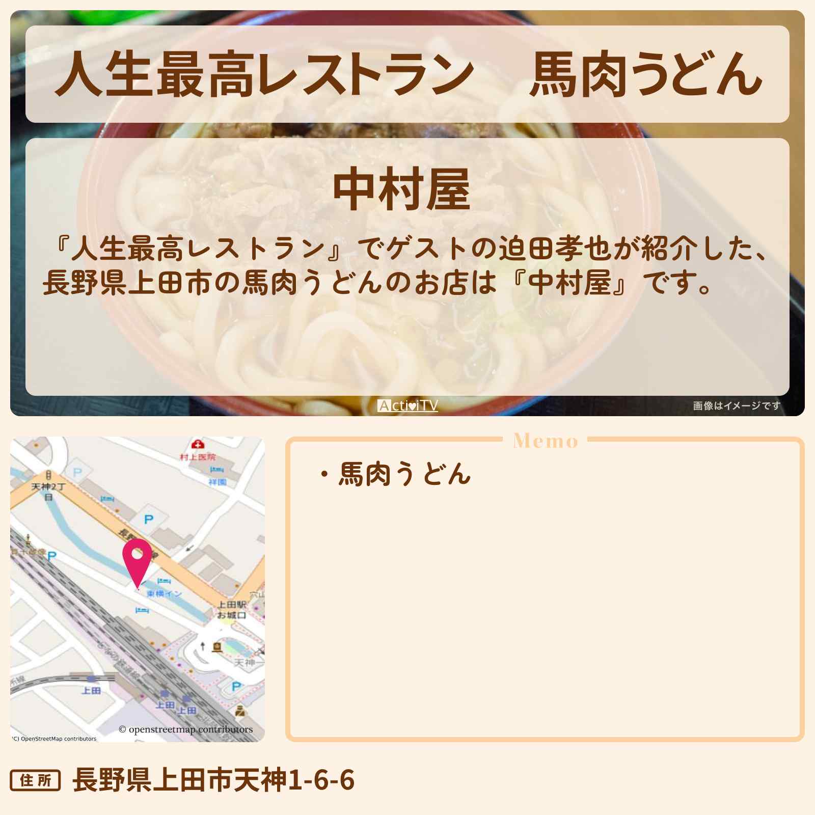 放送の【人生最高レストラン】でゲストの迫田孝也が紹介した、長野県上田市の馬肉うどんのお店は『中村屋』です。
