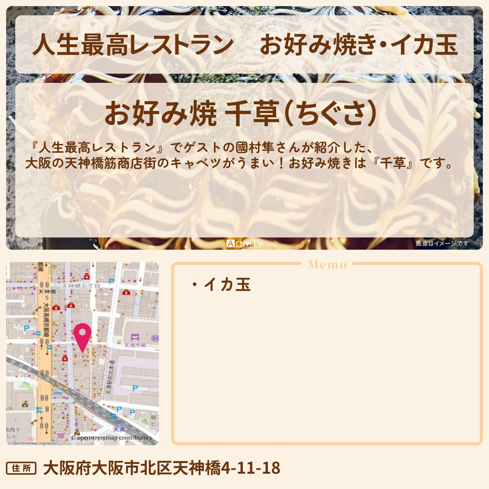 放送の【人生最高レストラン】でゲストの國村隼さんが紹介した、大阪の天神橋筋商店街のキャベツがうまい!お好み焼きは『千草』です。