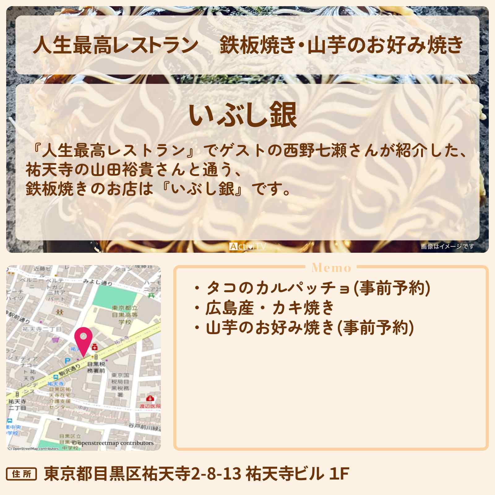 放送の【人生最高レストラン】でゲストの西野七瀬さんが紹介した、祐天寺の山田裕貴さんと通う、鉄板焼きのお店は『いぶし銀』です。