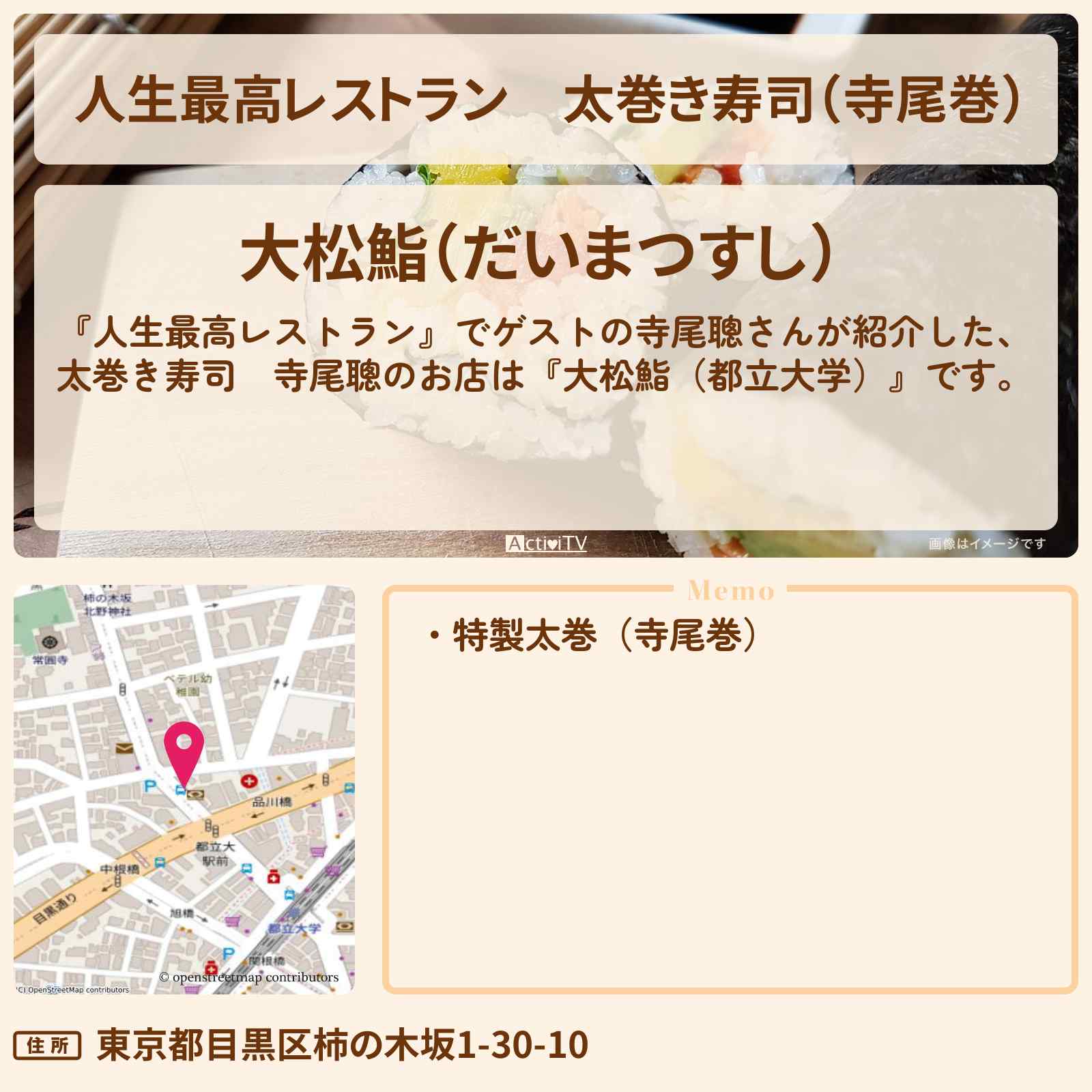 【人生最高レストラン】太巻き寿司(寺尾巻) 寺尾聰『大松鮨(都立大学)』のお店の場所