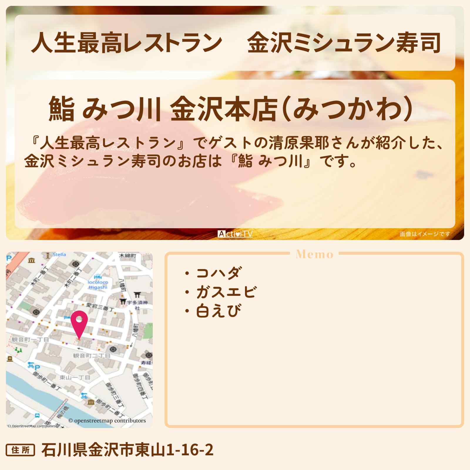 放送の【人生最高レストラン】でゲストの清原果耶さんが紹介した、金沢ミシュラン寿司のお店は『鮨 みつ川』です。
