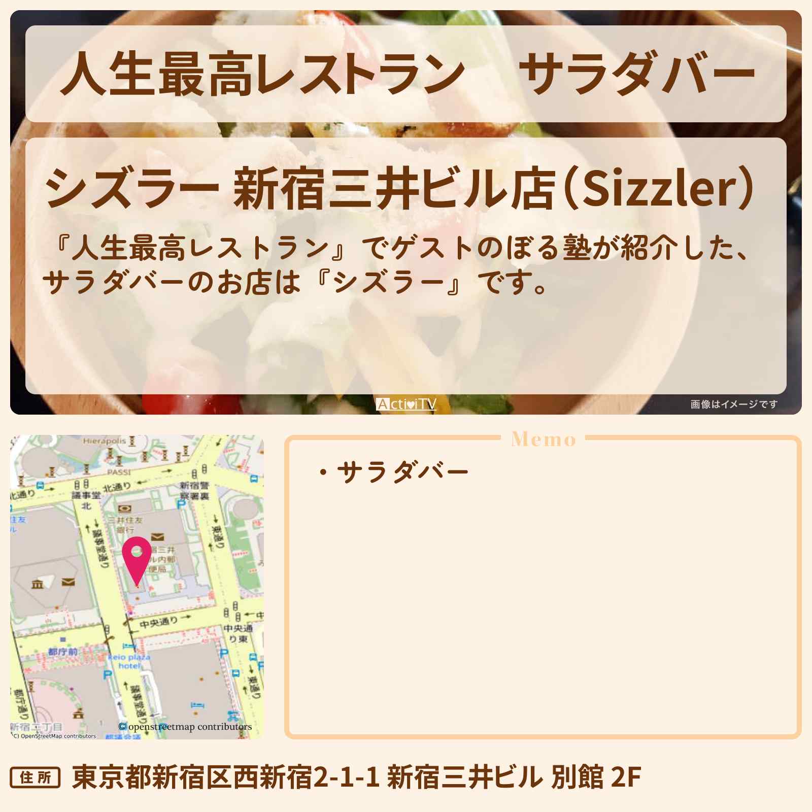 サラダバー 都庁前駅「シズラー 新宿三井ビル店(Sizzler)」