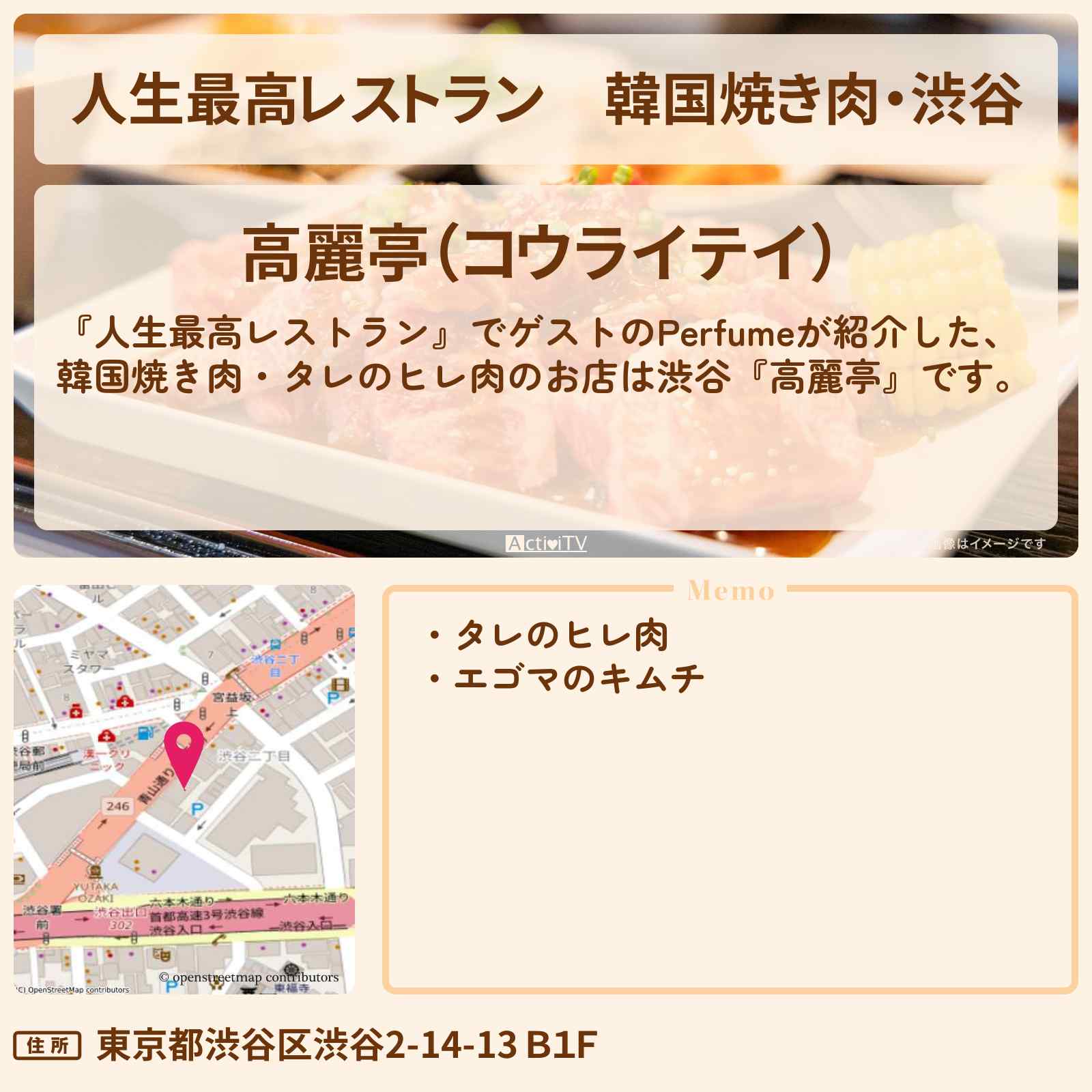 放送の【人生最高レストラン】でゲストのPerfumeが紹介した、韓国焼き肉・タレのヒレ肉のお店は渋谷『高麗亭』です。