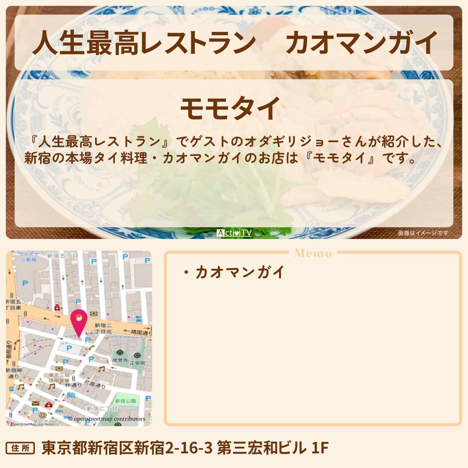 放送の【人生最高レストラン】でゲストのオダギリジョーさんが紹介した、新宿の本場タイ料理・カオマンガイのお店は『モモタイ』です。