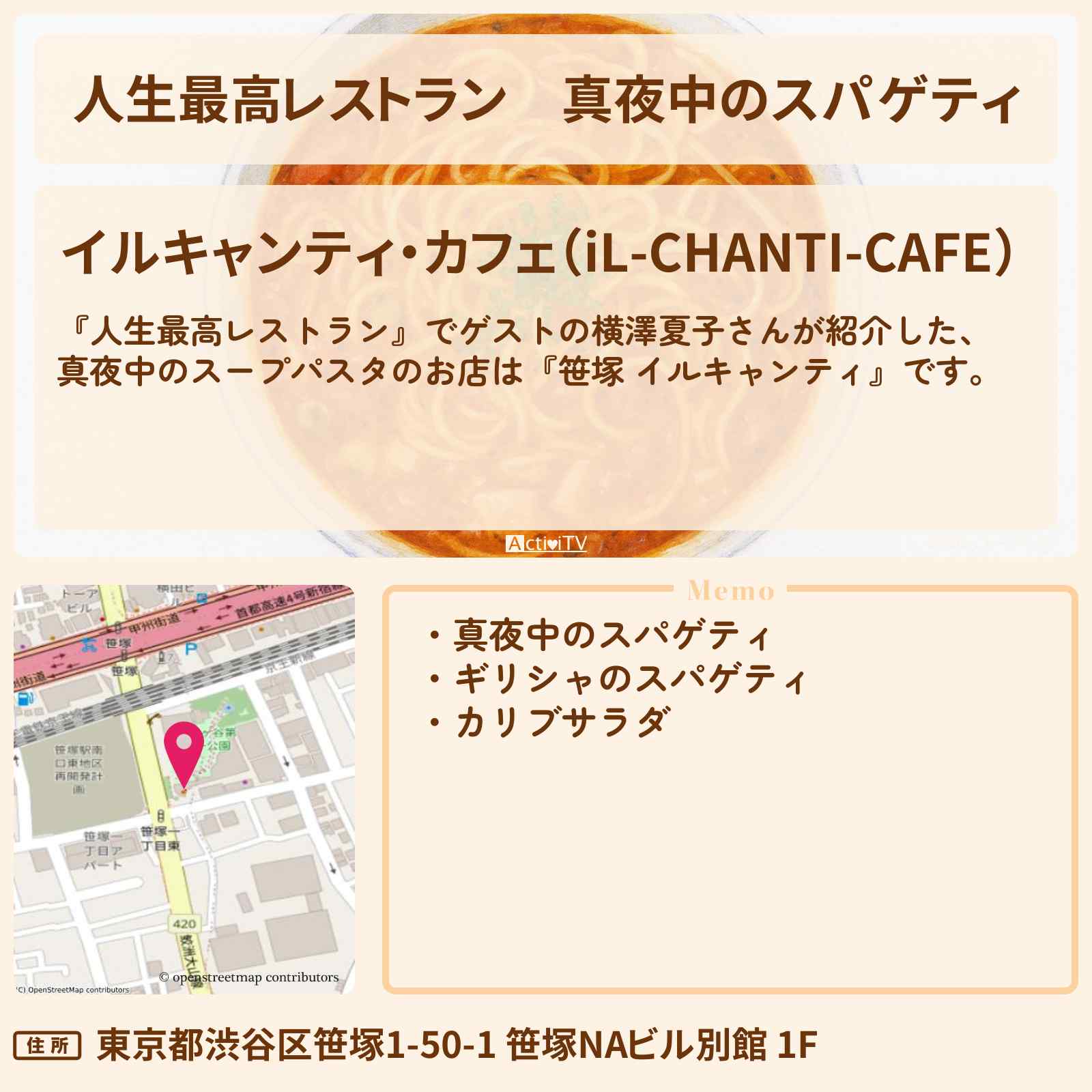 【人生最高レストラン】真夜中のスパゲティ『笹塚 イルキャンティ・カフェ』のお店の場所〔横澤夏子〕