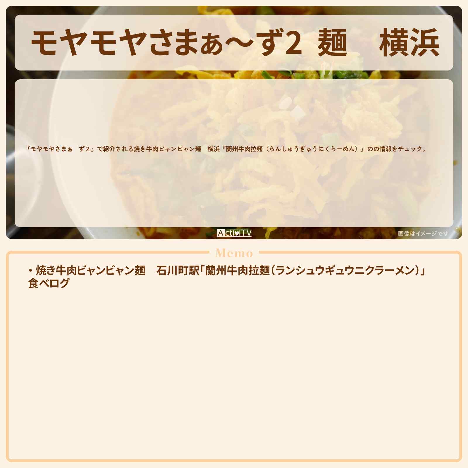 2019年9月29日(日)放送の【モヤモヤさまぁ~ず2】で紹介される焼き牛肉ビャンビャン麺 横浜『蘭州牛肉拉麺(らんしゅうぎゅうにくらーめん)』のの情報をチェック。
