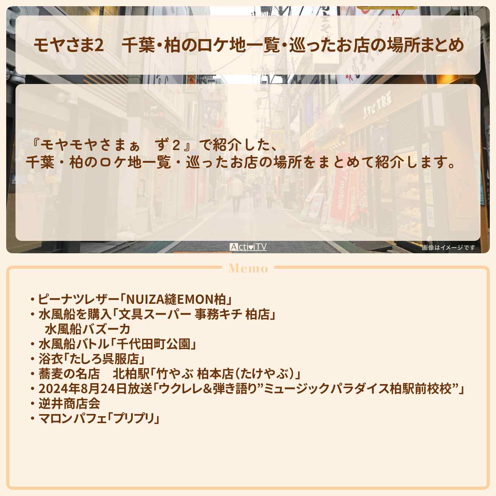 放送の【モヤモヤさまぁ~ず2】で紹介した、千葉・柏のロケ地一覧・巡ったお店の場所をまとめて紹介します。