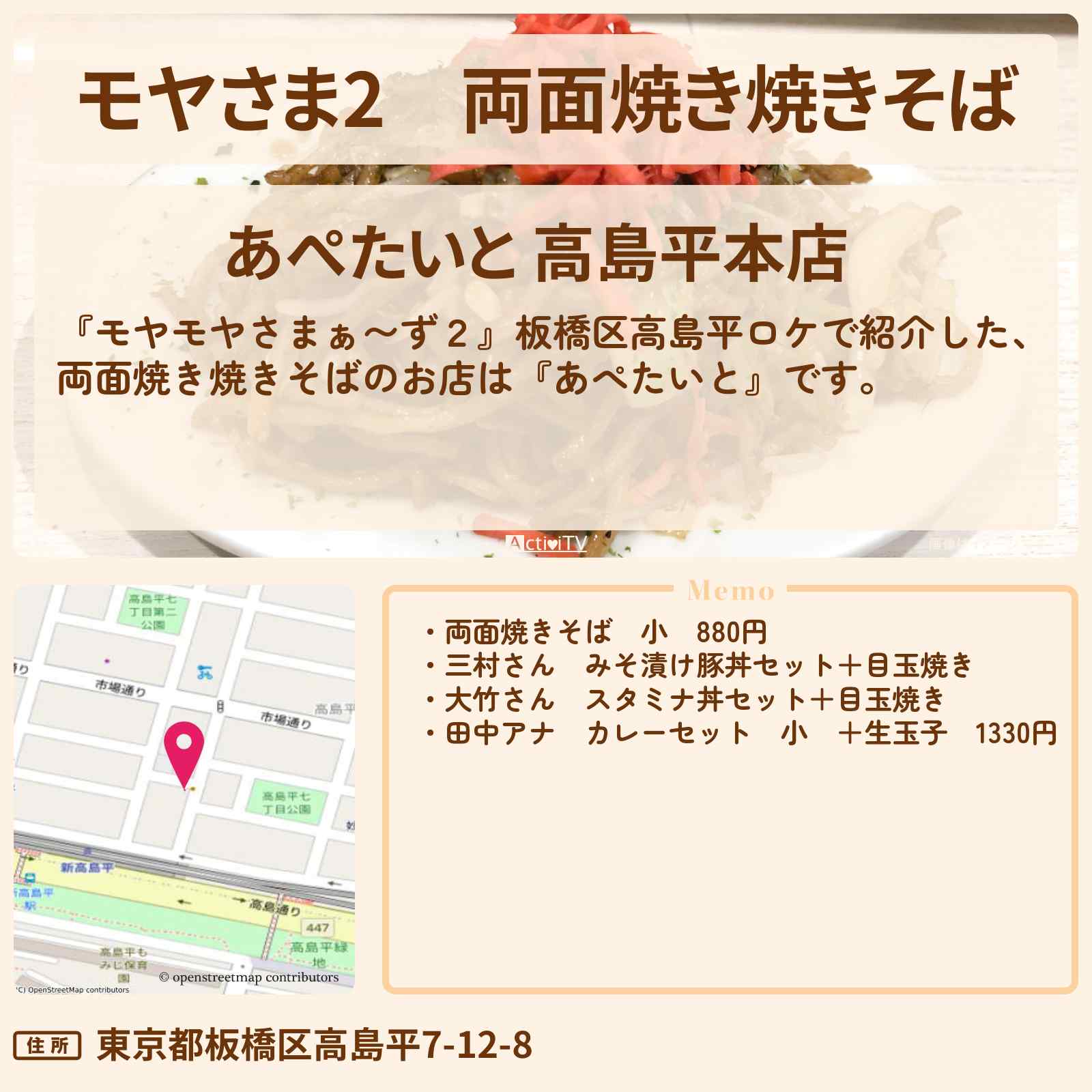 放送の【モヤモヤさまぁ〜ず2】板橋区高島平ロケで紹介した、両面焼き焼きそばのお店は『あぺたいと』です。