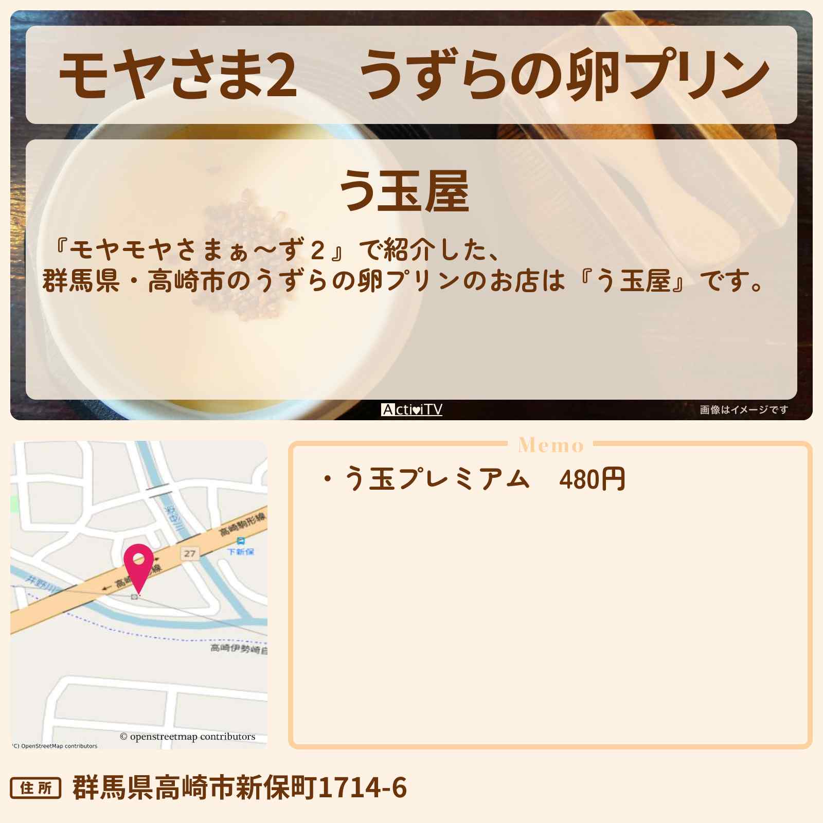 放送の【モヤモヤさまぁ〜ず2】で紹介した、群馬県・高崎市のうずらの卵プリンのお店は『う玉屋』です。