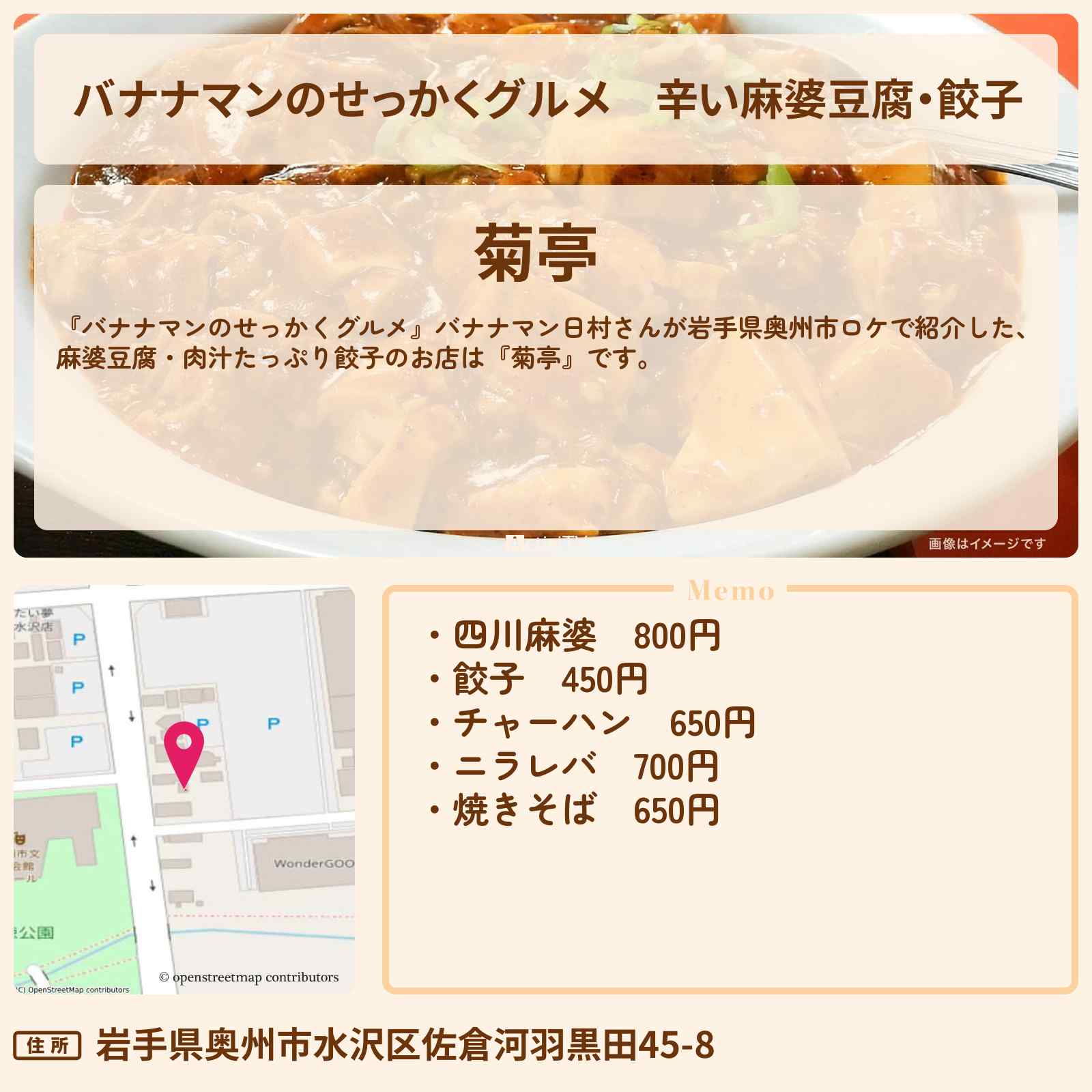 放送の【バナナマンのせっかくグルメ】バナナマン日村さんが岩手県奥州市ロケで紹介した、麻婆豆腐・肉汁たっぷり餃子のお店は『菊亭』です。