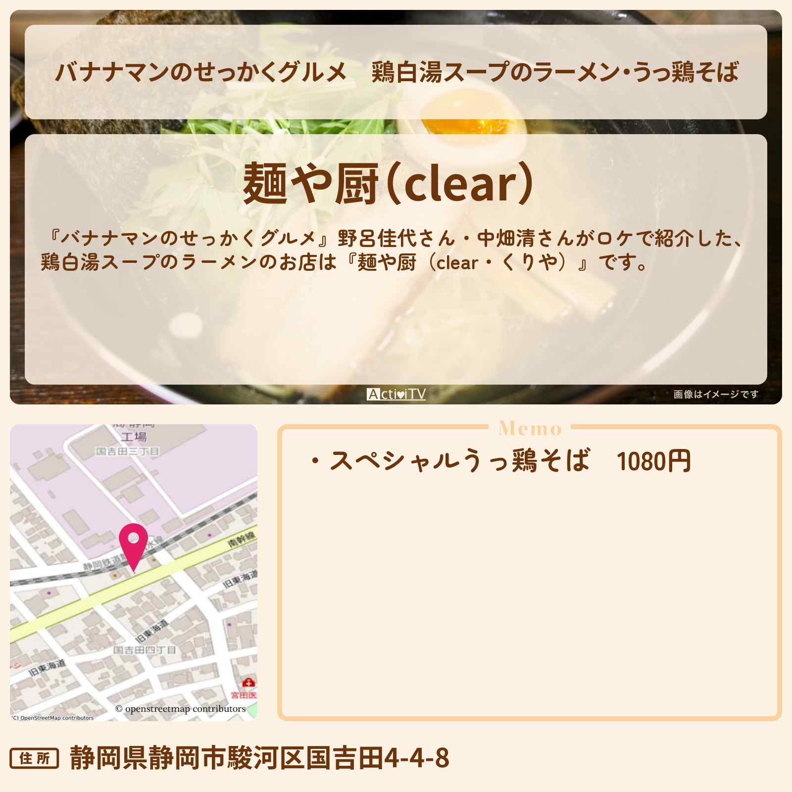 放送の【バナナマンのせっかくグルメ】野呂佳代さん・中畑清さんがロケで紹介した、鶏白湯スープのラーメンのお店は『麺や厨(clear・くりや)』です。