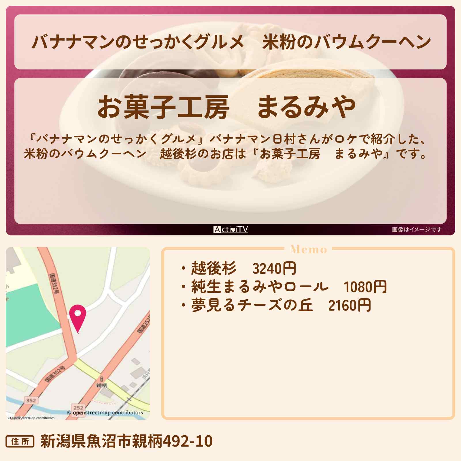 放送の【バナナマンのせっかくグルメ】バナナマン日村さんがロケで紹介した、米粉のバウムクーヘン 越後杉のお店は『お菓子工房 まるみや』です。