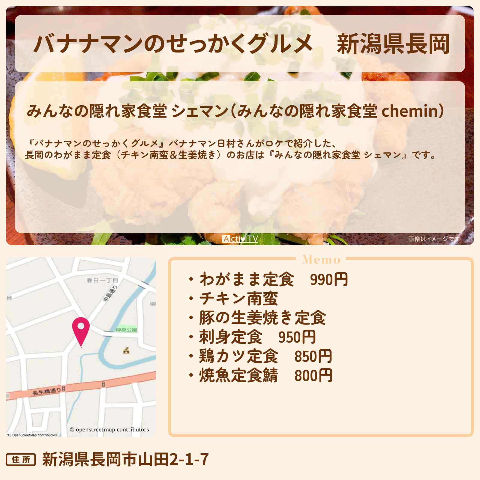 放送の【バナナマンのせっかくグルメ】バナナマン日村さんがロケで紹介した、長岡のわがまま定食(チキン南蛮&生姜焼き)のお店は『みんなの隠れ家食堂 シェマン』です。