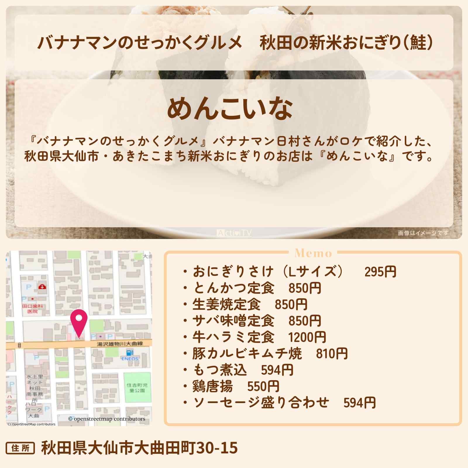 このお店の一番の魅力は、地元の秋田県産あきたこまちを使用したふんわりとしたおにぎりです。具材は鮭、梅、生たらこ、筋子など22種のおにぎりは多彩で、地元の味を堪能できます。特に「生たらこ」や「筋子」は人気が高く、訪れるたびに異なる組み合わせを楽しめるのも魅力です。
