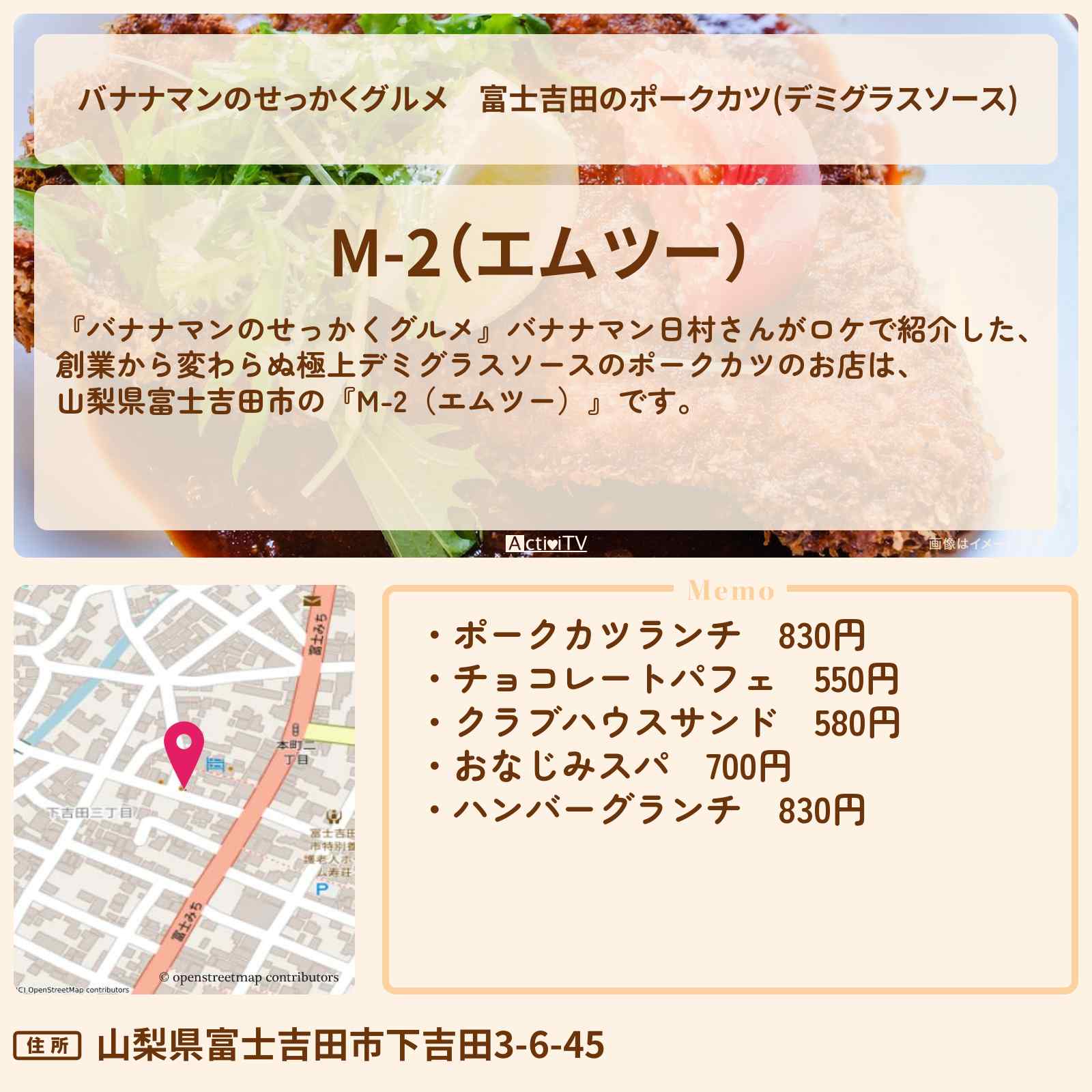 「洋食レストラン M-2」の情報は「富士吉田観光ガイド」で。昭和の面影が色濃く残る店内。コーヒーの香り漂うなか、ドリア、カツカレー、ハンバーグなど、往年の洋食が楽しめる。夭逝したフジファブリックの志村正彦さんが愛した大根スパゲッティも健在。…